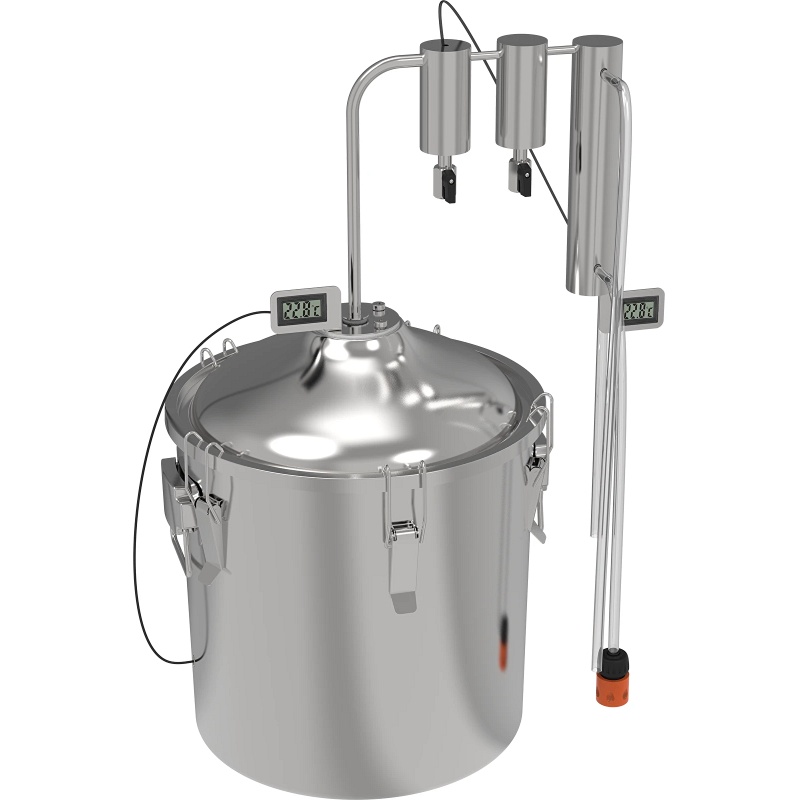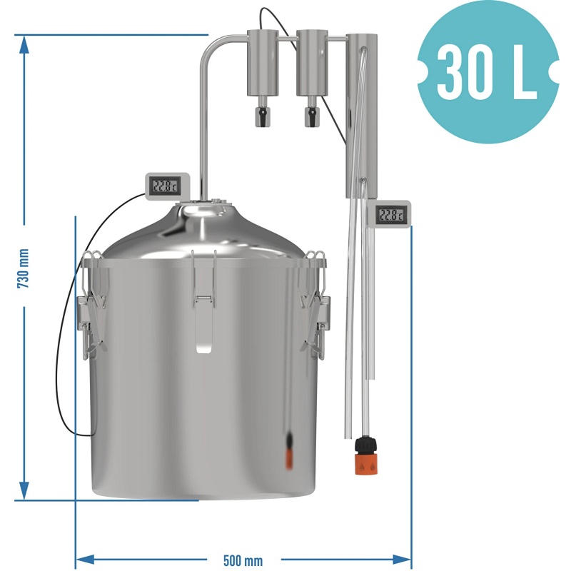 L'appareil de distillation est équipé d'une cuve de 30 litres (avec un niveau de remplissage recommandé jusqu'à 90 % du volume et minimum 25 %) et d'un condenseur avec deux cuves de clarification et deux thermomètres, permettant la distillation sans équipement supplémentaire. Cet ensemble est compatible avec différentes sources de chaleur. Deux thermomètres précis avec sondes facilitent le contrôle de la température, à l'intérieur de la cuve et dans la cuve de clarification. Un tuyau en PVC plastifié avec raccord permet un raccordement rapide de l'entrée et de la sortie d'eau. Un tuyau en silicone est utilisé pour recueillir le distillat.