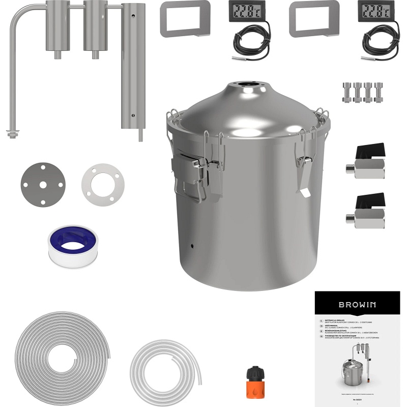 • Ensemble complet - L'ensemble comprend une cuve de 30 litres avec couvercle convexe, un condenseur avec deux séparateurs, deux thermomètres électroniques avec piles, des vannes pour les séparateurs, deux tuyaux, un raccord d'alimentation en eau, le matériel de montage et un mode d'emploi.