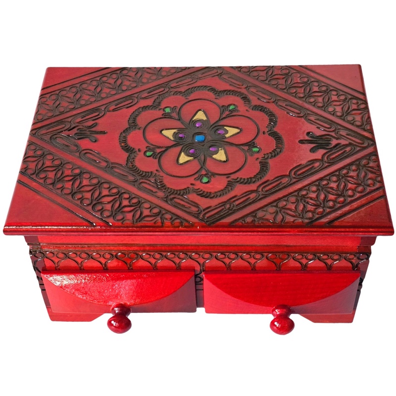 Cette boîte à bijoux unique d'un rouge vif est un véritable bijou parmi les solutions de rangement pour vos bijoux. Le couvercle richement décoré, orné d'ornements sculptés à la main et finement laqué, crée une alliance harmonieuse d'élégance et d'art traditionnel.
