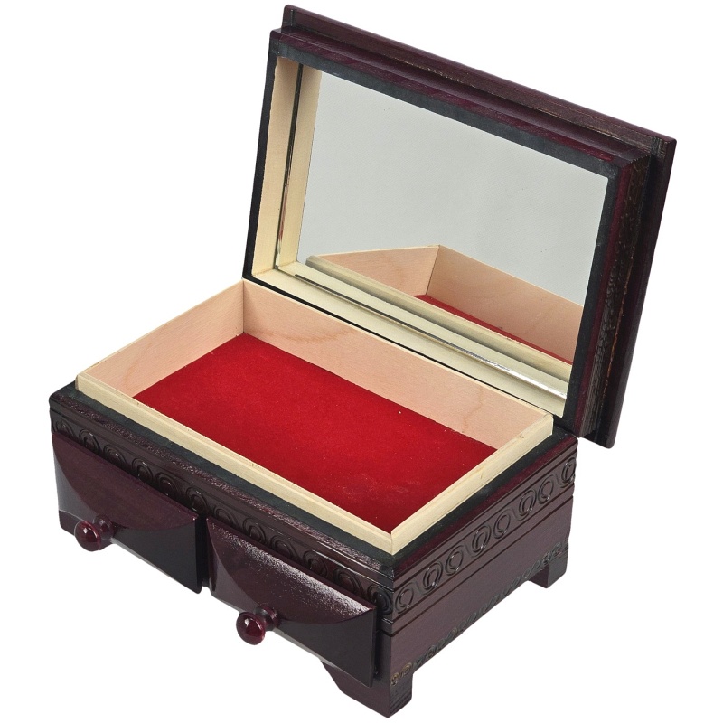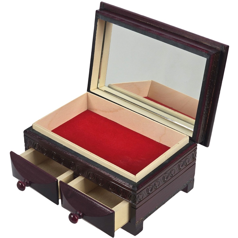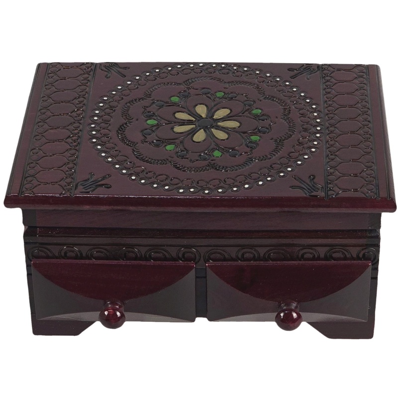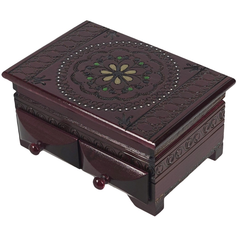 Vous vous demandez où ranger vos bijoux préférés ou vos précieux bibelots pour qu'ils soient toujours bien rangés et embellissent votre espace ? Cette boîte à bijoux se distingue par son motif ornemental unique et sa teinte lie-de-vin qui lui confèrent une personnalité unique. Grâce à sa structure en bois massif et à ses deux tiroirs, elle protégera efficacement vos accessoires et sera également un élément décoratif qui s'inscrit dans la tradition populaire.