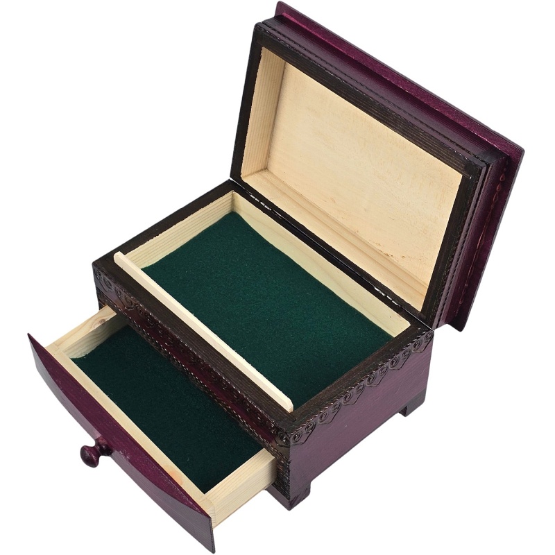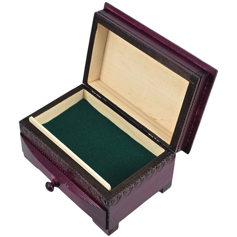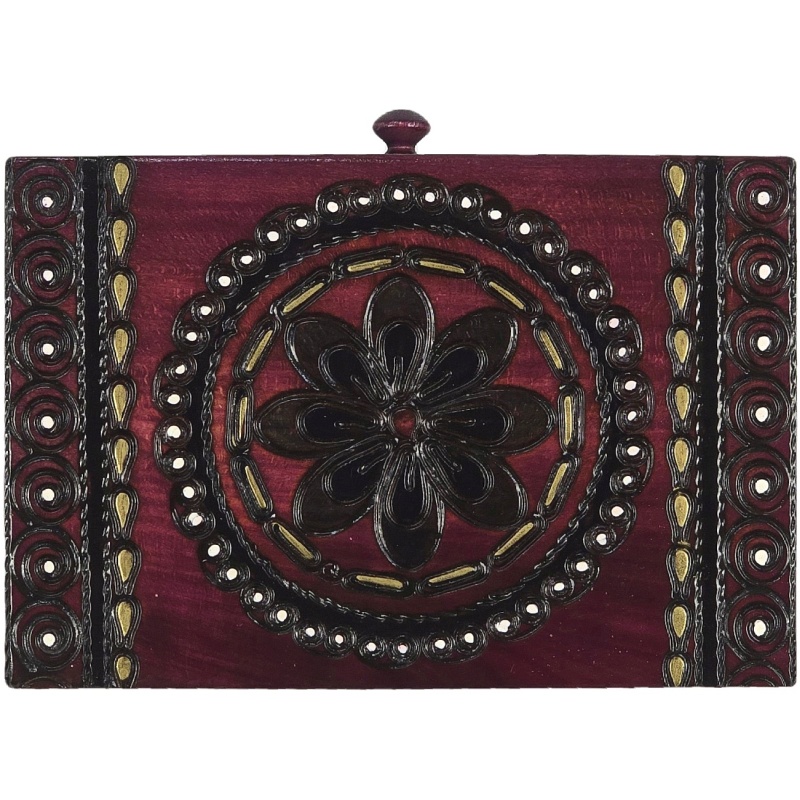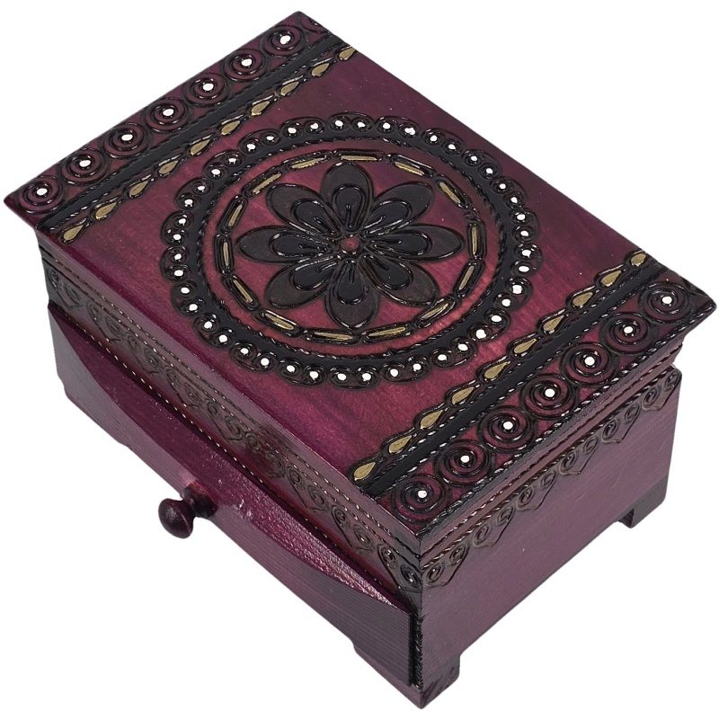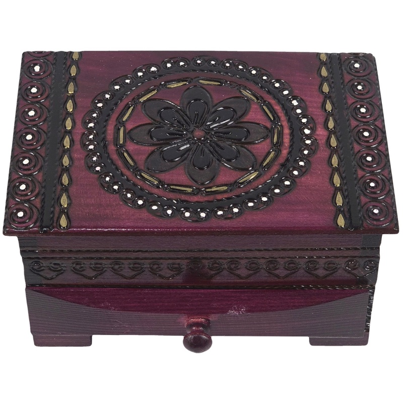 Cette boîte à bijoux en bois unique dans une riche teinte bordeaux est une belle combinaison d'artisanat traditionnel et de design élégant. Richement décoré de motifs ornementaux gravés à la main et de subtils détails dorés, il offre non seulement un rangement pratique pour vos objets de valeur, mais devient également un élément décoratif distinctif pour chaque foyer.