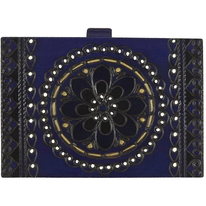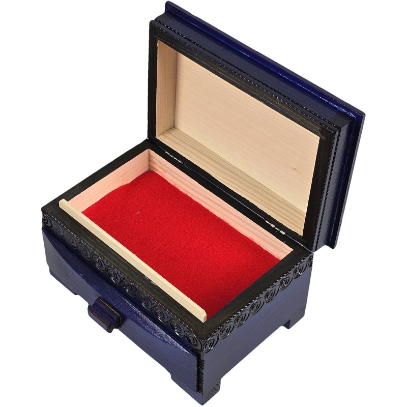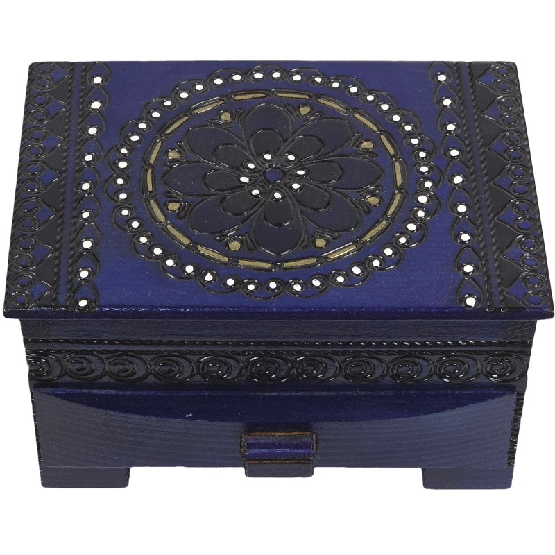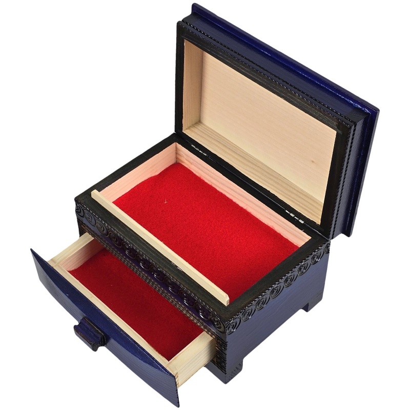Cette élégante boîte à bijoux en bois d'un bleu profond est un véritable bijou parmi les accessoires de rangement. Richement décorée de gravures à la main, de délicats motifs ornementaux et de subtils détails dorés et noirs, elle apporte une touche de luxe, de tradition et de savoir-faire à tout espace. C'est l'endroit idéal pour ranger vos plus précieux trésors.