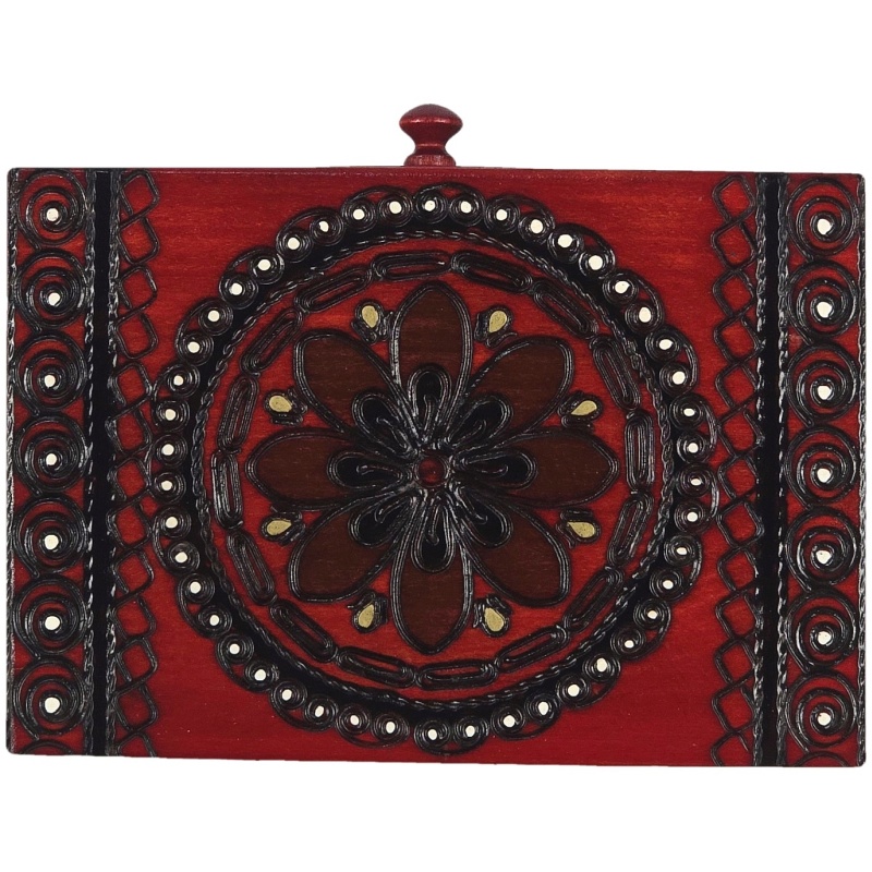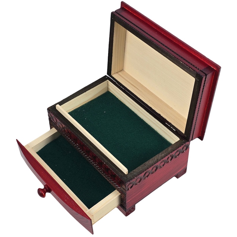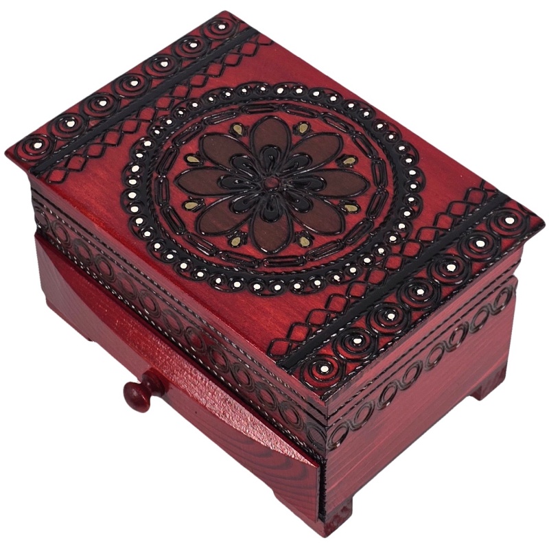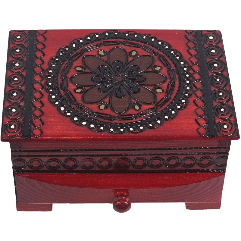 Cette élégante boîte à bijoux en bois dans une teinte rouge chaleureuse est une belle combinaison d'artisanat traditionnel et de design distinctif. Une riche décoration ornementale, des détails gravés à la main et de subtiles touches de couleur font de cette boîte à bijoux non seulement un espace de rangement pratique, mais aussi un élément décoratif exceptionnel qui apportera une touche d'élégance et de tradition à votre intérieur.