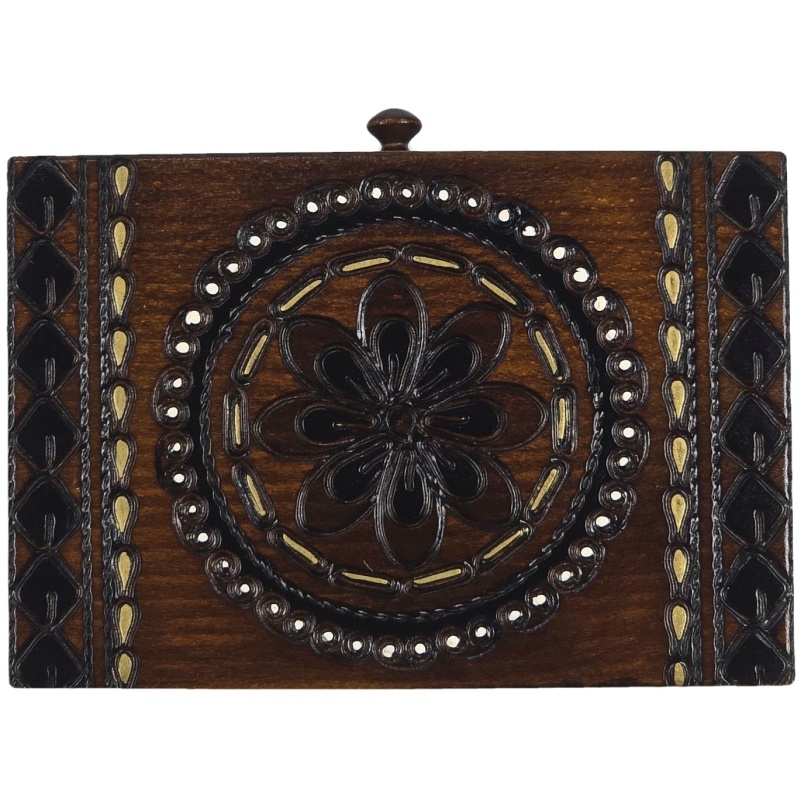 Cette élégante boîte à bijoux en bois brun foncé allie à la perfection savoir-faire traditionnel et élégance intemporelle. Décorée à la main de motifs ornementaux détaillés et de subtiles touches de couleur, elle allie luxe et beauté naturelle du bois. Idéal pour ranger vos bijoux et souvenirs les plus précieux.
