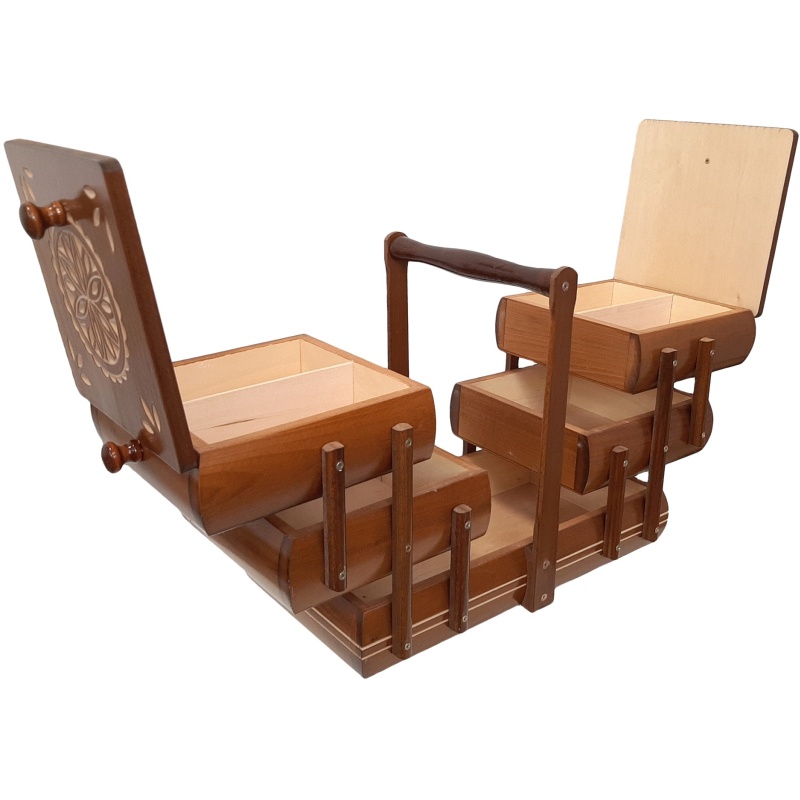 Cette boîte à bijoux pliante unique en bois, dotée d'une élégante poignée de transport, allie parfaitement savoir-faire artisanal, design fonctionnel et esthétique. Ses riches ornements sculptés et sa maniabilité en font un véritable trésor.