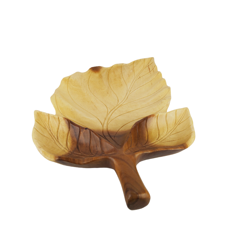 Ce magnifique bol en forme de trèfle illustre parfaitement comment un matériau naturel peut devenir une œuvre d'art. Sa forme s'inspire de la structure d'une feuille : trois parties distinctes, reliées en leur centre, créent un ensemble harmonieux, non seulement décoratif, mais aussi extrêmement pratique. La surface du bol est finement sculptée, mettant en valeur les nervures de la feuille, soulignant son origine naturelle et son travail artisanal. Les transitions de couleurs entre les tons clairs et foncés du bois lui confèrent un aspect naturel et élégant.