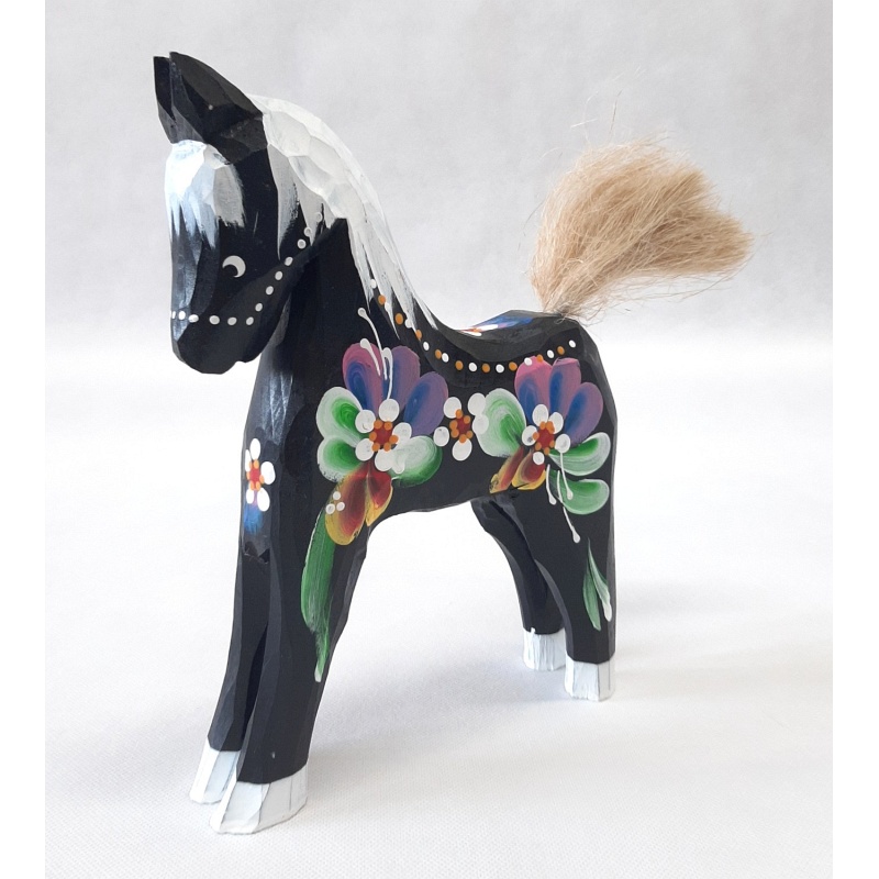 Apportez élégance et originalité à votre intérieur avec ce cheval en bois peint à la main d'un noir élégant. Son design unique s'inspire de motifs folkloriques traditionnels, qui ressortent encore davantage sur un fond sombre. Grâce à ses dimensions de 18 x 15 cm, vous pouvez facilement le placer sur une étagère, une table ou une commode et égayer instantanément n'importe quelle pièce.