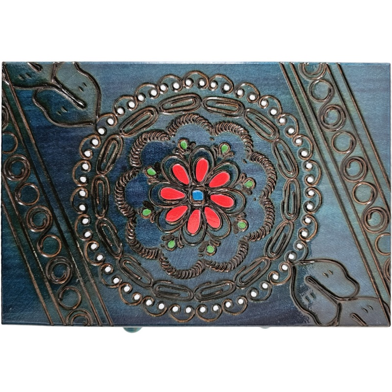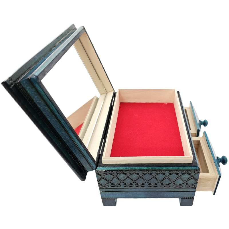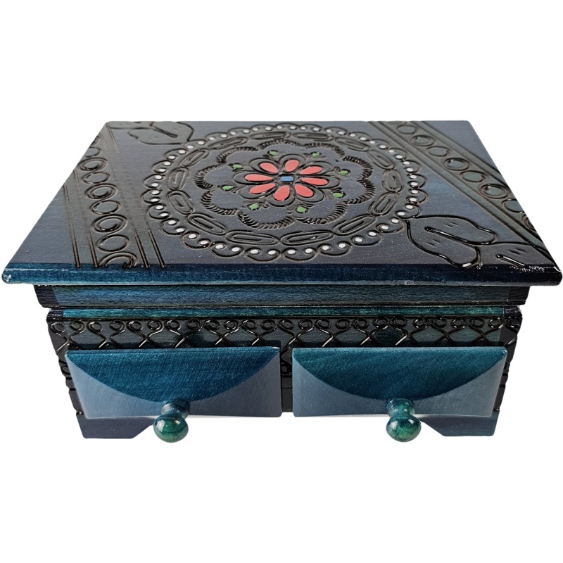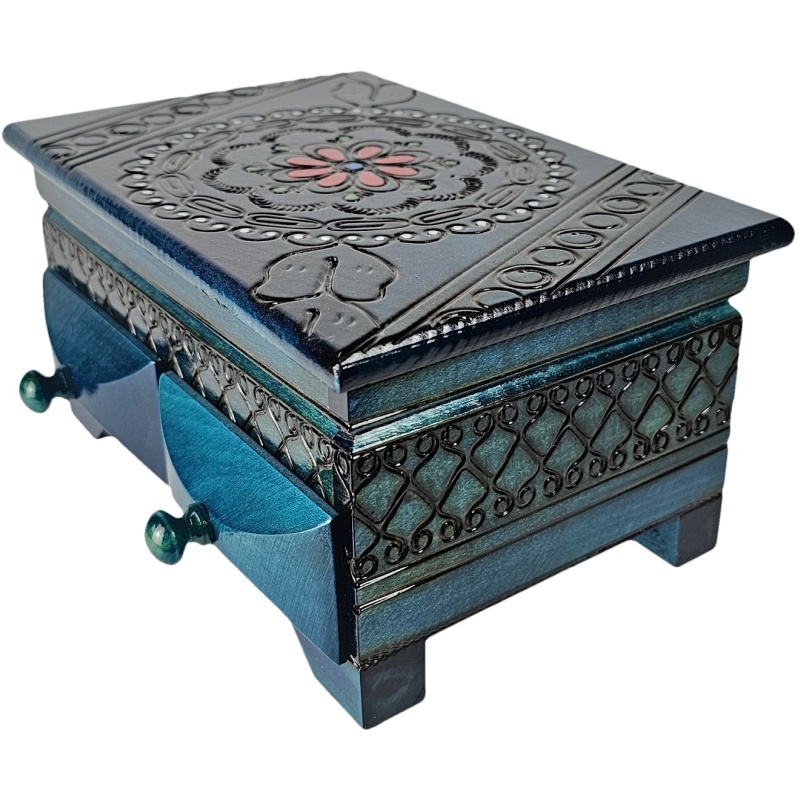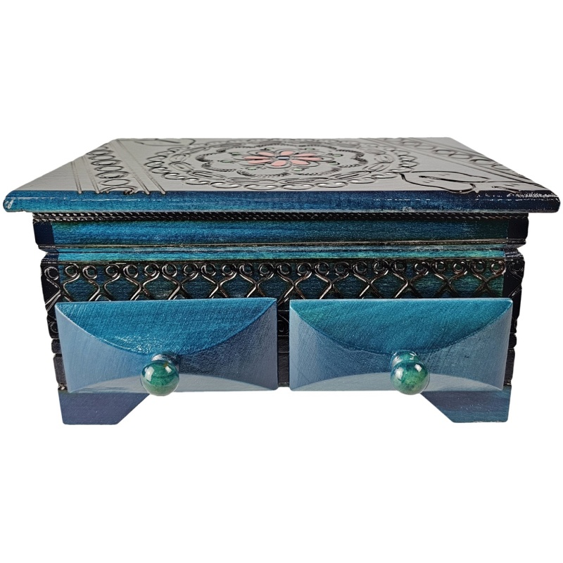 Découvrez le charme de l'artisanat traditionnel et l'élégance pratique de cette boîte à bijoux unique en bois sculpté à la main. Des détails richement décorés, une teinte bleu foncé intense et des tiroirs pratiques font de ce coffret à bijoux une pièce exceptionnelle au quotidien.