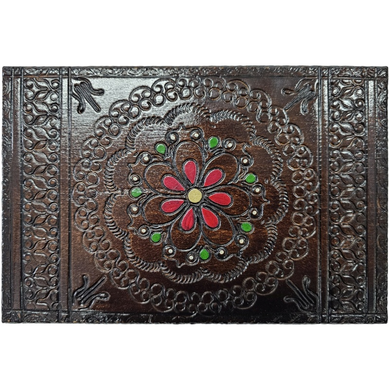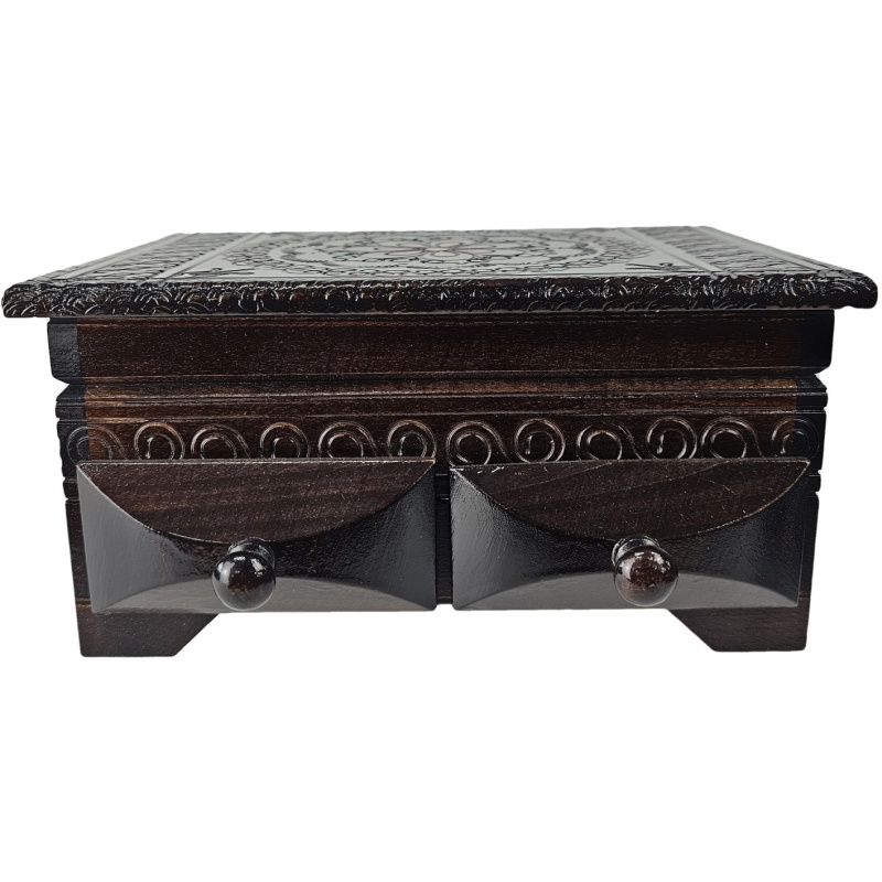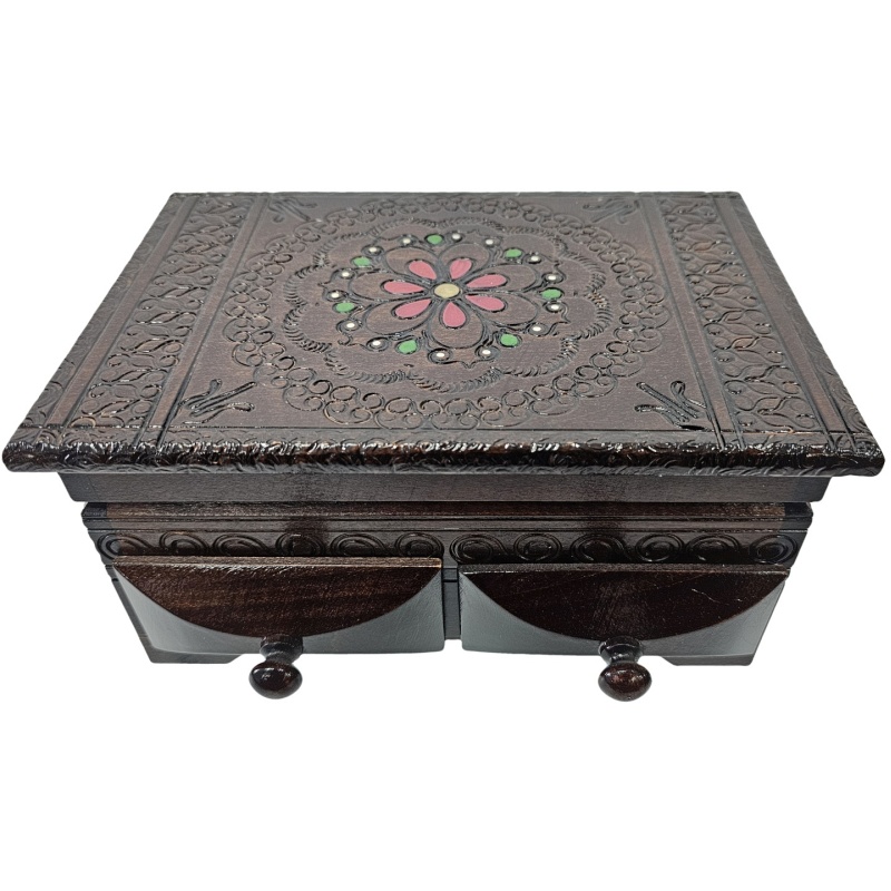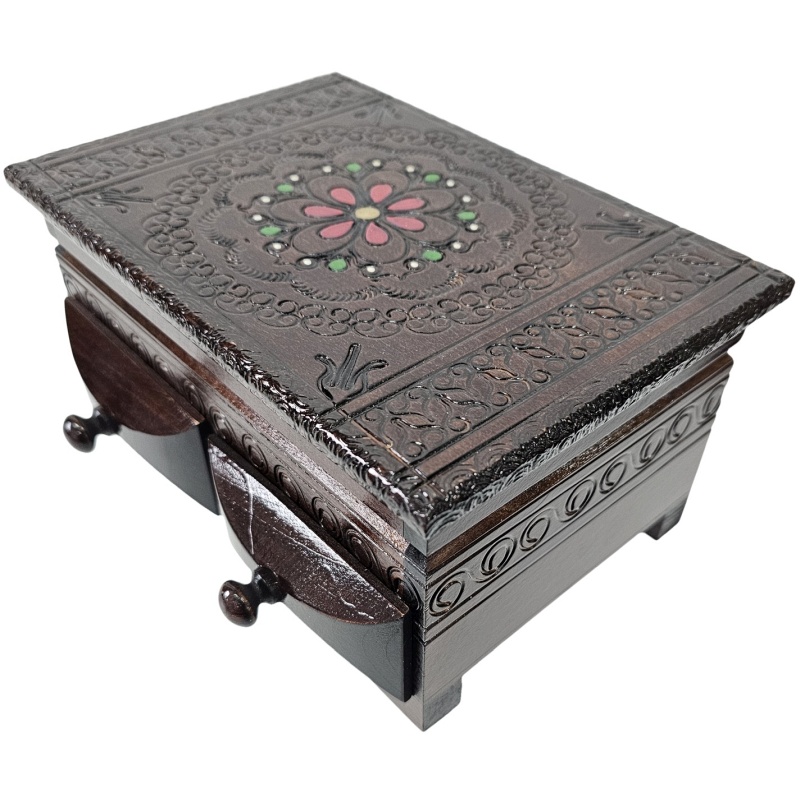 Découvrez le charme de l'artisanat traditionnel et l'élégance intemporelle avec cette boîte à bijoux en bois sculptée à la main. Teinture foncée, gravures délicates et touches de couleur subtiles font de cette pièce un espace de rangement unique à l'esprit artistique.