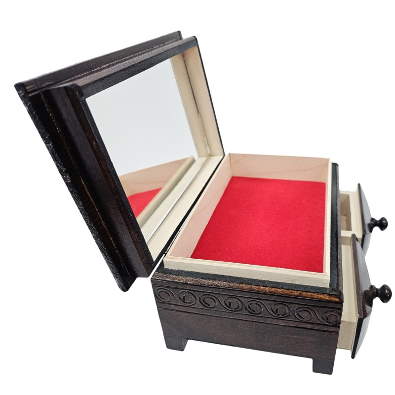 Ce coffret à bijoux en bois à la finition foncée allie praticité et raffinement visuel. Il est idéal pour les amateurs de détails, de savoir-faire artisanal et de style intemporel.