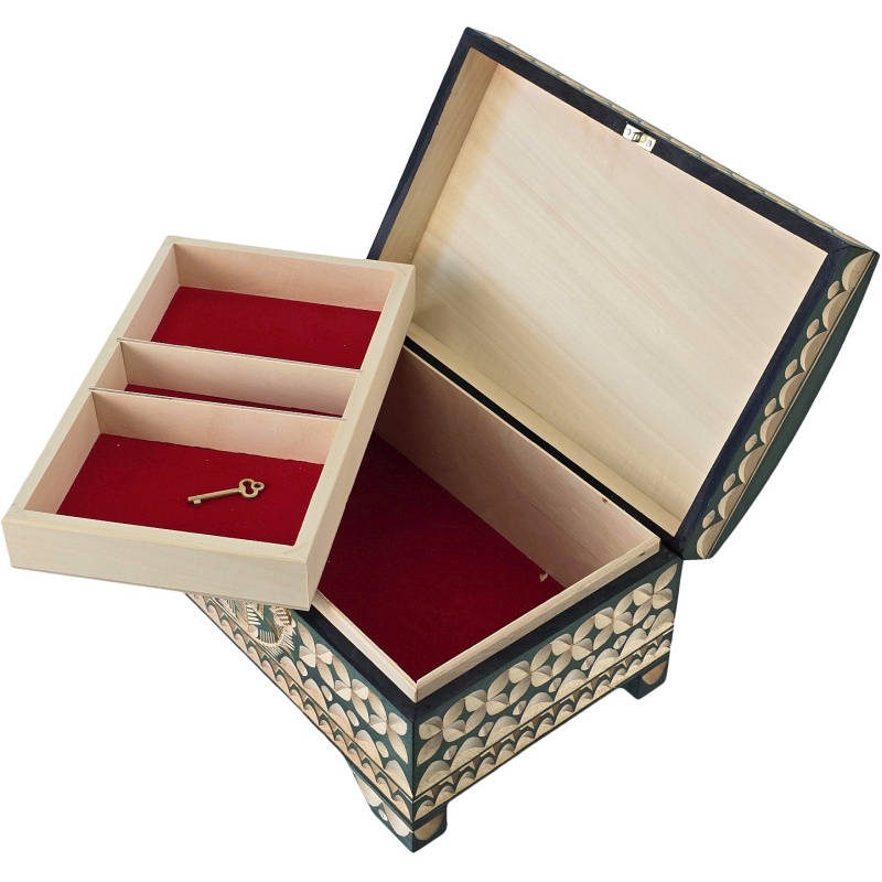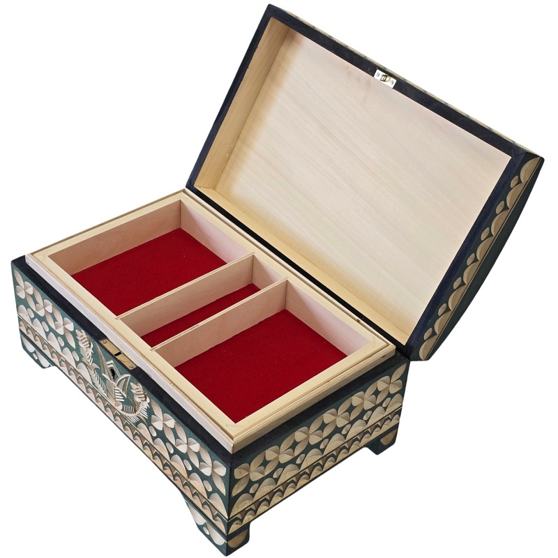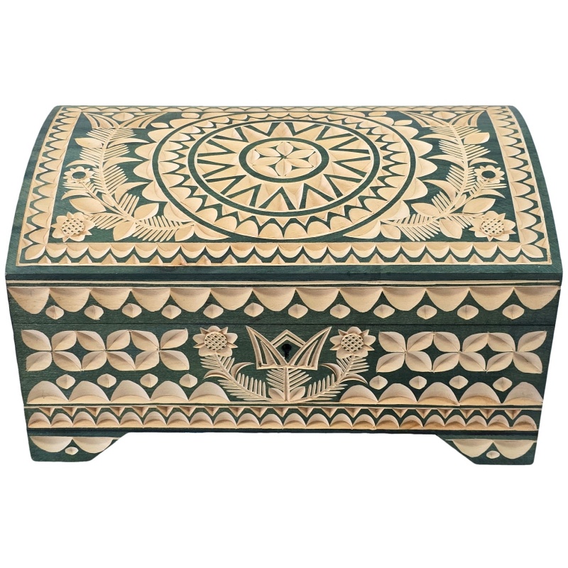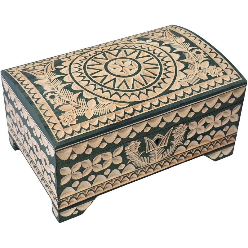• Motif folklorique sculpté à la main – Chaque motif de ce coffret à bijoux est soigneusement sculpté à la main : ornements floraux, formes géométriques et symboles créent une composition harmonieuse avec une touche de tradition.