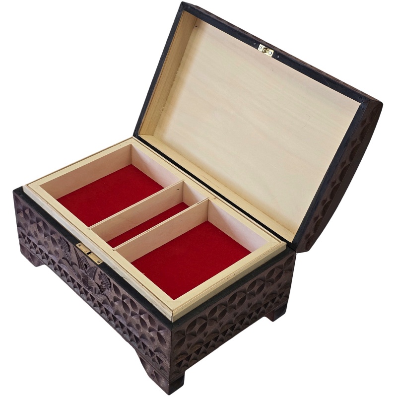 Ce coffret à bijoux en bois sculpté à la main, d'une teinte marron foncé, est la preuve que l'artisanat traditionnel a sa place dans les intérieurs modernes. Sa forme équilibrée, ses motifs précis et sa teinte naturelle en font non seulement un espace de rangement, mais aussi un élément décoratif impressionnant, à la fois chaleureux et noble.
