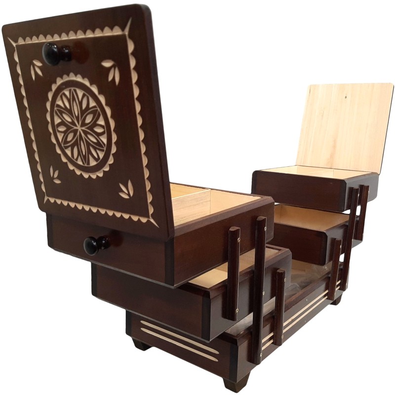 • Couvercle décoré au motif précis – Les parties supérieures de la boîte à bijoux sont ornées d'un motif circulaire sculpté aux lignes fines et aux incrustations contrastées, soulignant l'esthétique du produit et lui conférant une touche d'art populaire.
