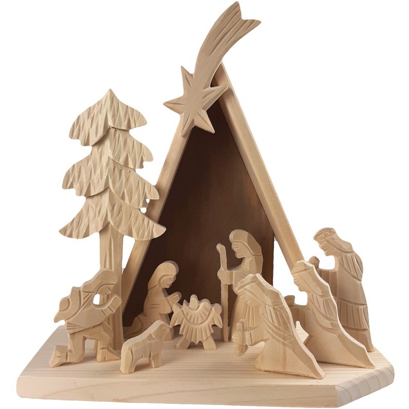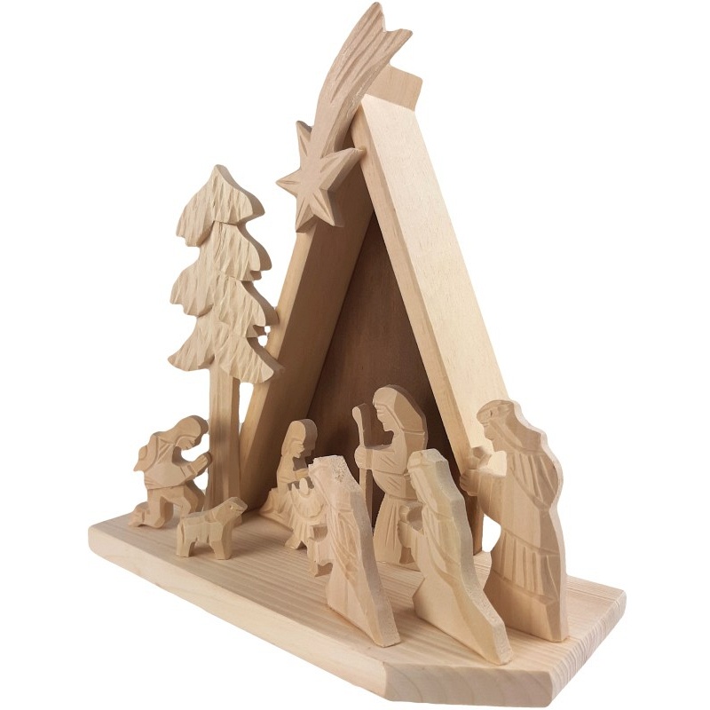 Cette crèche originale, en forme d'abri triangulaire orné d'un arbre distinctif et d'une étoile annonciatrice, incarne le savoir-faire artisanal et un message spirituel profond. Chaque élément est sculpté avec amour du détail et respect de la tradition. C'est un accessoire discret et pourtant extrêmement impressionnant qui apportera à votre intérieur une ambiance festive exceptionnelle.