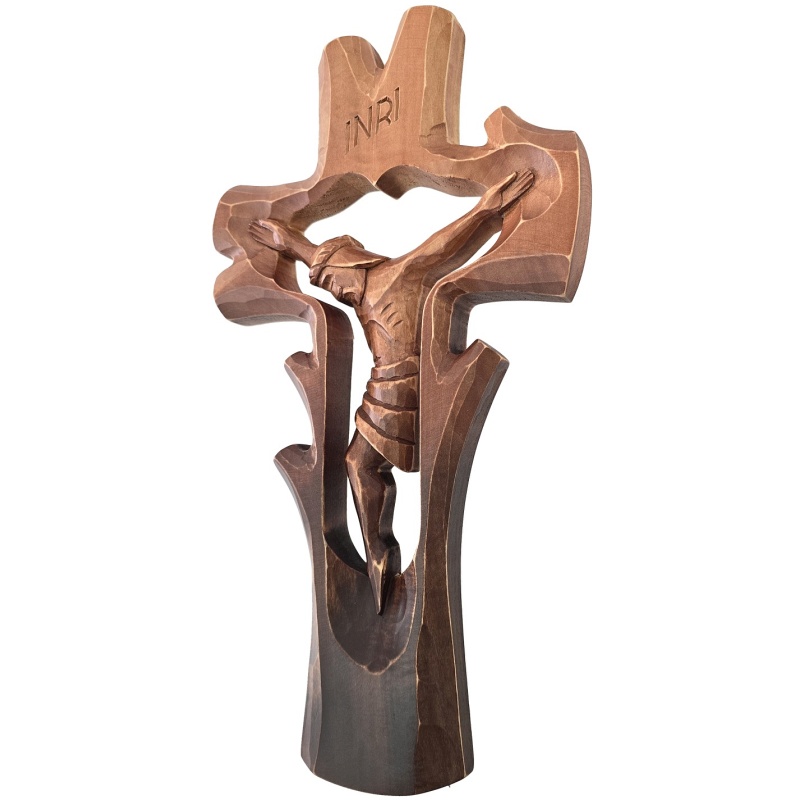 Cette exceptionnelle croix en bois massif, ornée de la figure de Jésus-Christ, est sculptée à la main. Sa forme moderne, avec sa silhouette du Crucifié, est à la fois dynamique et profondément symbolique. Le contraste saisissant entre la teinte sombre du bois et la délicate gravure du Christ portant l'inscription INRI, crée un équilibre harmonieux entre savoir-faire artisanal et message spirituel. Grâce à sa forme originale et à son design détaillé, la croix est non seulement un symbole spirituel fort, mais aussi une œuvre d'art précieuse.