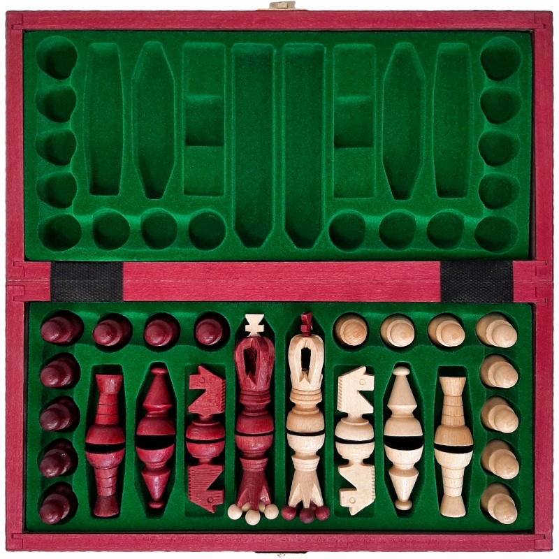Ces élégantes pièces d'échecs en bois mesurant 31 × 31 cm sont la combinaison parfaite de l'artisanat traditionnel, des matériaux naturels et du design esthétique. Ils se distinguent par leur fabrication de haute qualité, le contraste unique du bois naturel et teinté bordeaux, et la précision de leurs pièces qui font de chaque partie une expérience exceptionnelle.