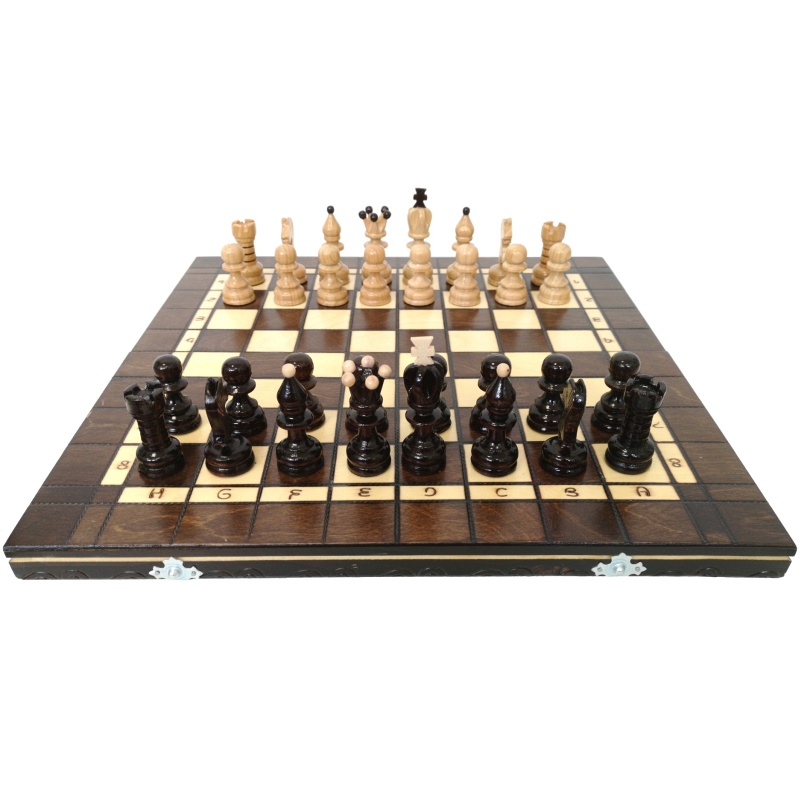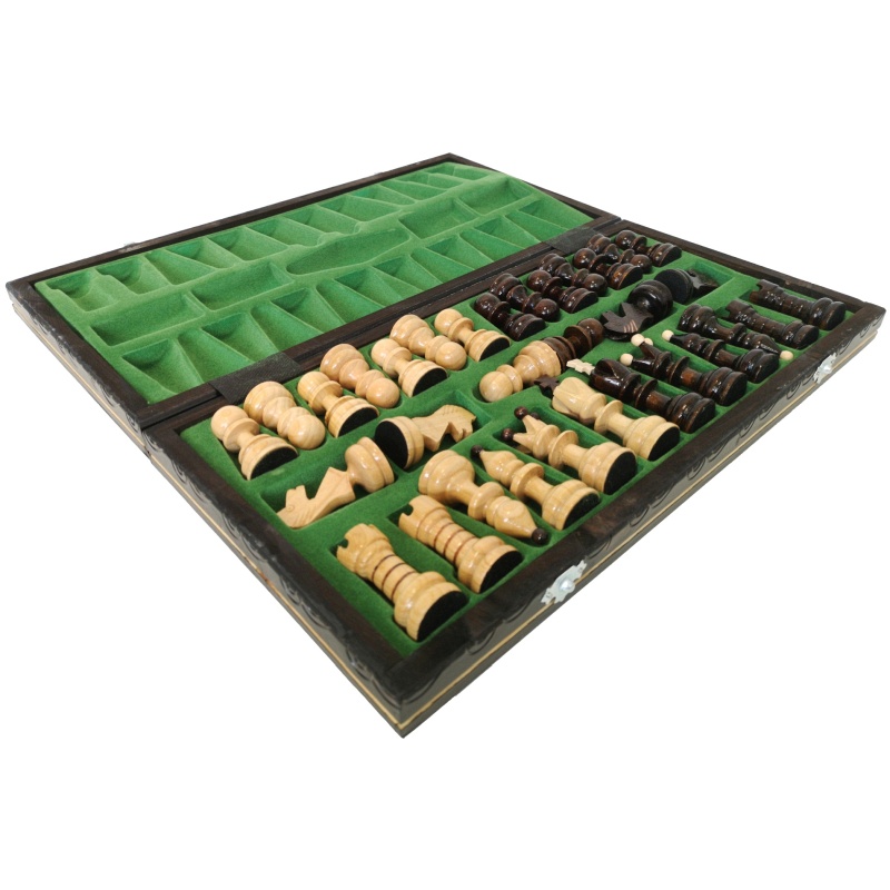 Pièces d'échecs faites main au contraste élégant : Les pièces, richement teintées et brillantes, sont façonnées avec précision et ornées d'éléments décoratifs originaux, conférant au jeu un aspect exceptionnel.