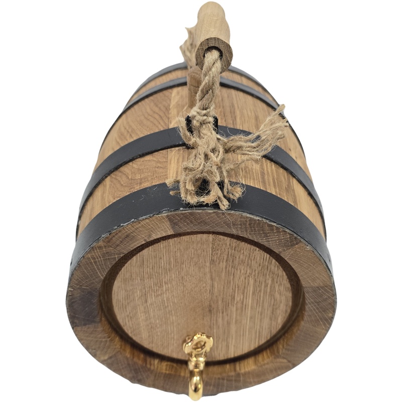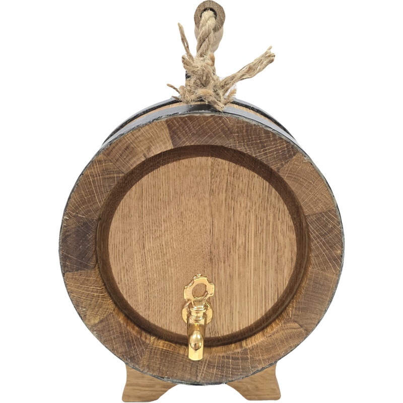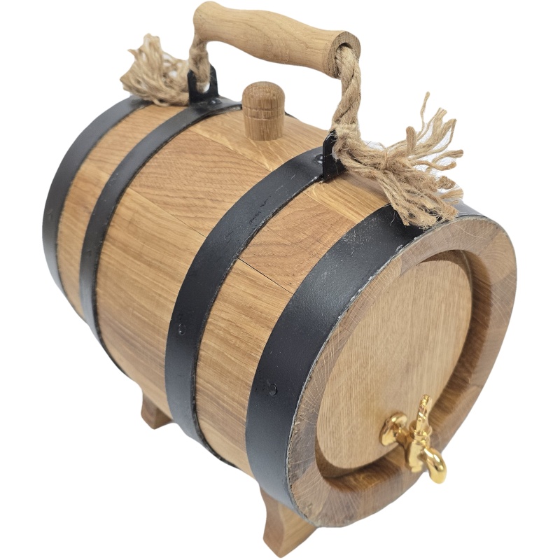 Ce magnifique fût en chêne français de 3 litres impressionne dès le premier coup d'œil par son savoir-faire artisanal et le contraste élégant entre la teinte chaleureuse du bois naturel et les cercles en acier noir distinctifs. Il est équipé d'une poignée en bois pratique recouverte d'une corde, ce qui facilite son transport et lui confère une touche rustique qui souligne son aspect unique. Le robinet en laiton assure un soutirage confortable et précis, sans coulures indésirables.