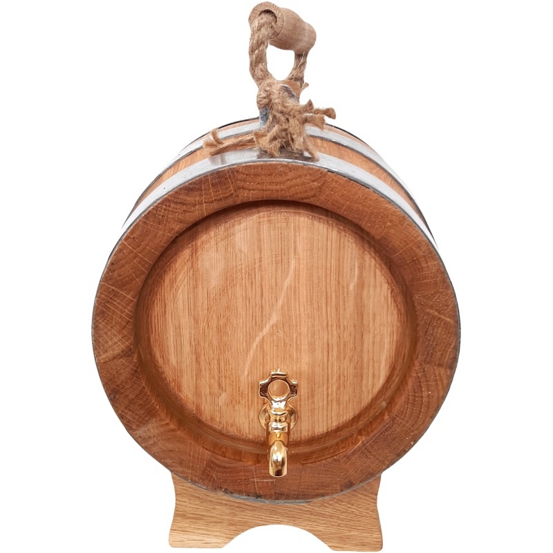 Cet élégant fût en chêne de 3 litres est fabriqué en chêne dur de haute qualité, reconnu pour sa résistance, sa durabilité et sa capacité à enrichir naturellement le goût des boissons. Sa poignée en bois pratique, munie de cordes solides, facilite son transport et en fait non seulement un accessoire élégant, mais aussi un outil de service pratique. Des anneaux métalliques solides assurent la stabilité de la structure, tandis que le robinet en laiton permet un versement précis et élégant de la boisson sans goutter.