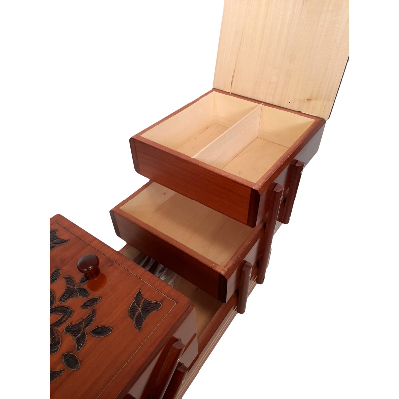 Découvrez la beauté d'un design pratique et d'un savoir-faire artisanal dans cette boîte à bijoux exceptionnelle. Son corps robuste, ses tons brun-rouge foncé distinctifs et ses ornements cuits à la main sur le couvercle en font non seulement un espace de rangement, mais aussi un ajout impressionnant à votre intérieur. Le mécanisme de pliage offre un espace exceptionnel et une excellente vue d'ensemble : la solution idéale pour les amateurs d'ordre, de tradition et d'esthétique.