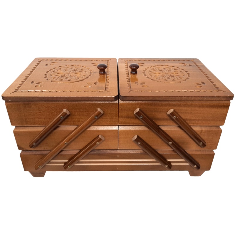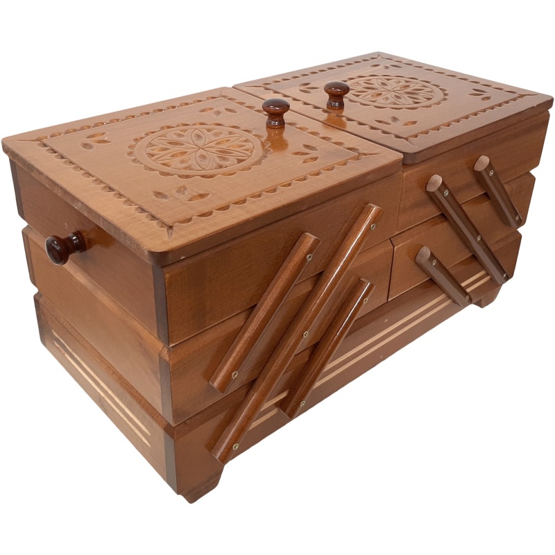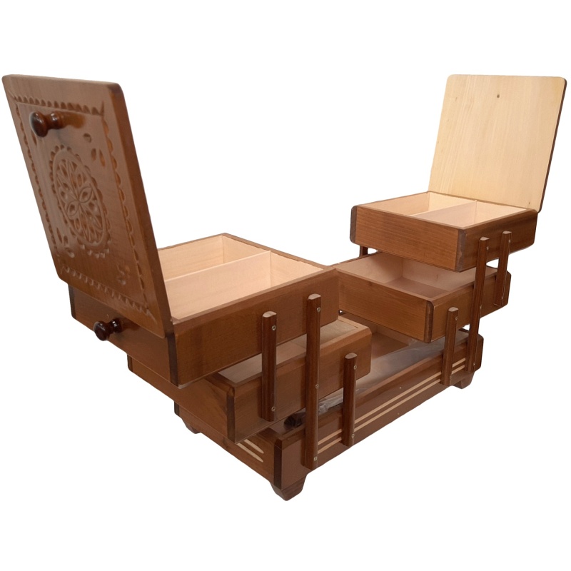 Ce grand coffret à bijoux en bois allie à la perfection style traditionnel, rangement pratique et savoir-faire artisanal. Sa forme harmonieuse, son motif finement sculpté et son système de pliage à plusieurs niveaux en font une pièce exceptionnelle pour tous ceux qui souhaitent ranger leurs trésors avec style et organisation. Idéal pour la maison, le chalet et comme cadeau de prestige.