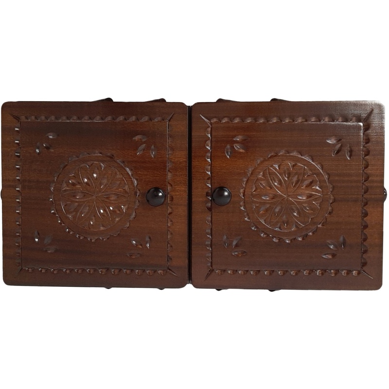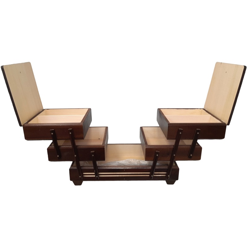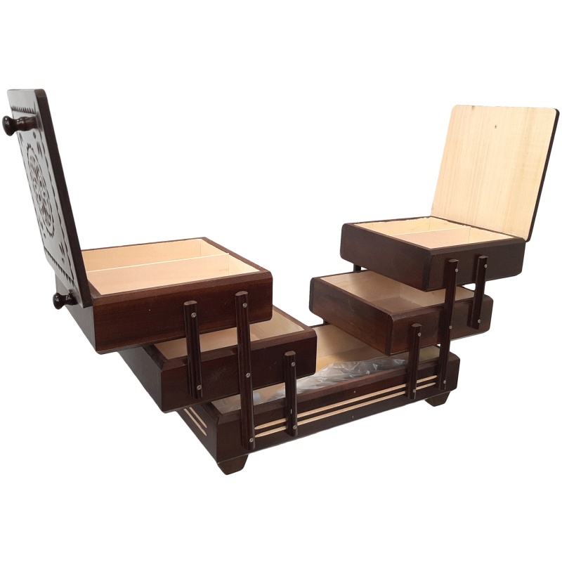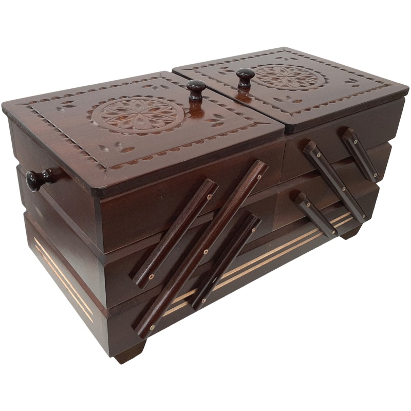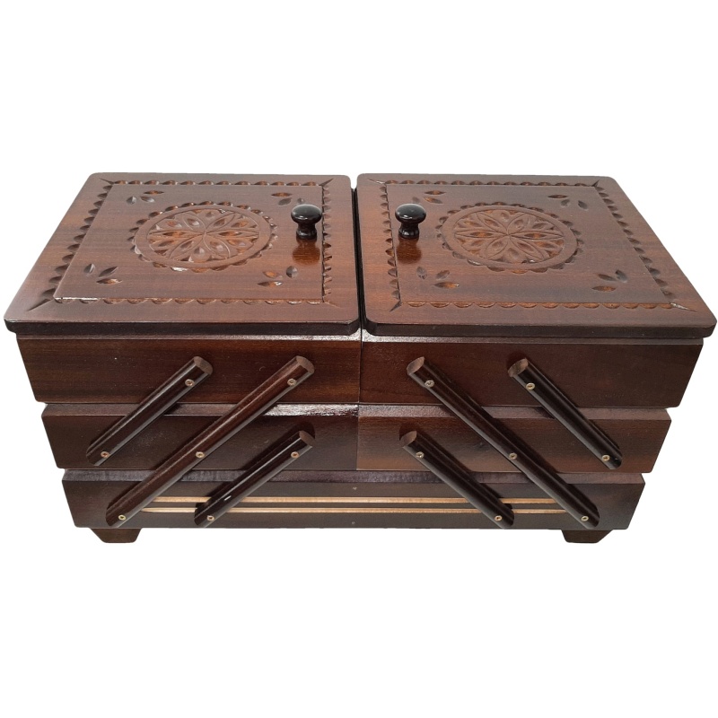 Ce coffret à bijoux robuste en bois foncé allie design traditionnel et praticité. Son couvercle finement sculpté, sa couleur profonde et son système de pliage multi-compartiments en font la solution idéale pour ranger bijoux, fournitures de loisirs créatifs ou trésors de famille. C'est une pièce qui non seulement sert, mais qui représente aussi.