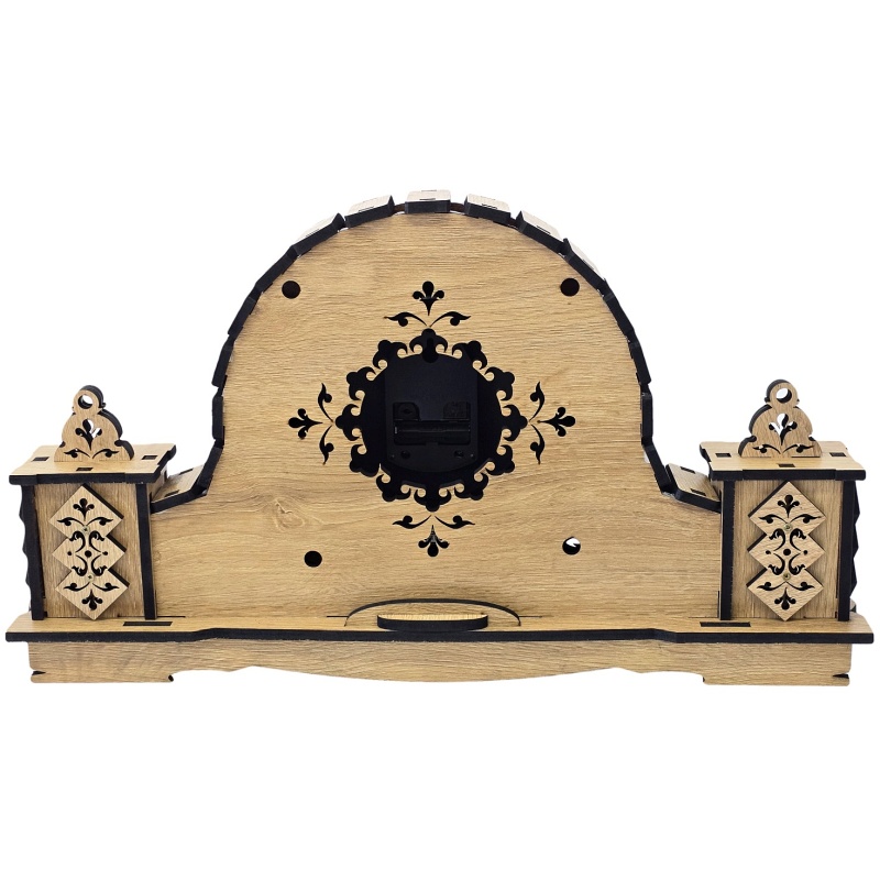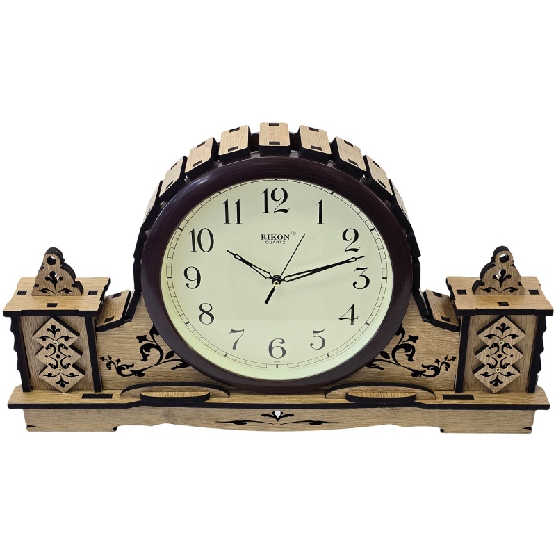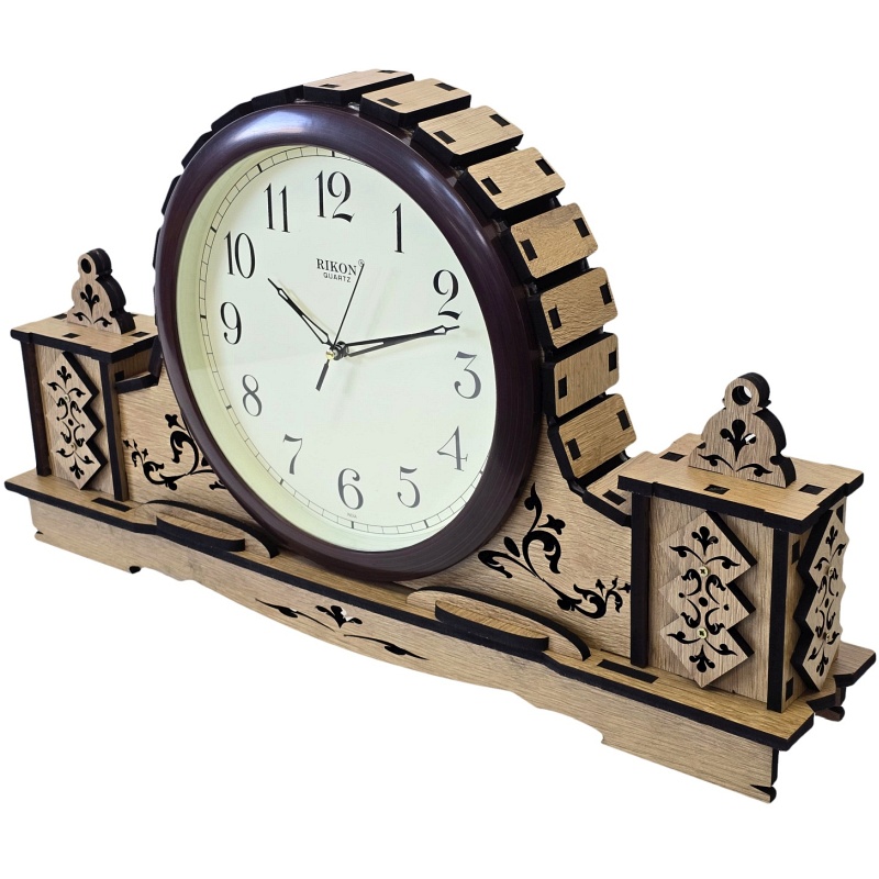 Cette horloge de table en bois allie avec brio design traditionnel, précision de la sculpture et fiabilité. Son élément principal est un grand cadran circulaire encastré dans une découpe centrale, entouré d'une structure en bois aux montants latéraux symétriques. Le boîtier est réalisé en matériaux naturels stratifiés, orné d'ornements sculptés détaillés et de touches sombres qui soulignent le motif décoratif. Grâce à l'association d'une teinte de bois claire et de découpes noires, l'horloge est noble, digne et esthétiquement intemporelle.
