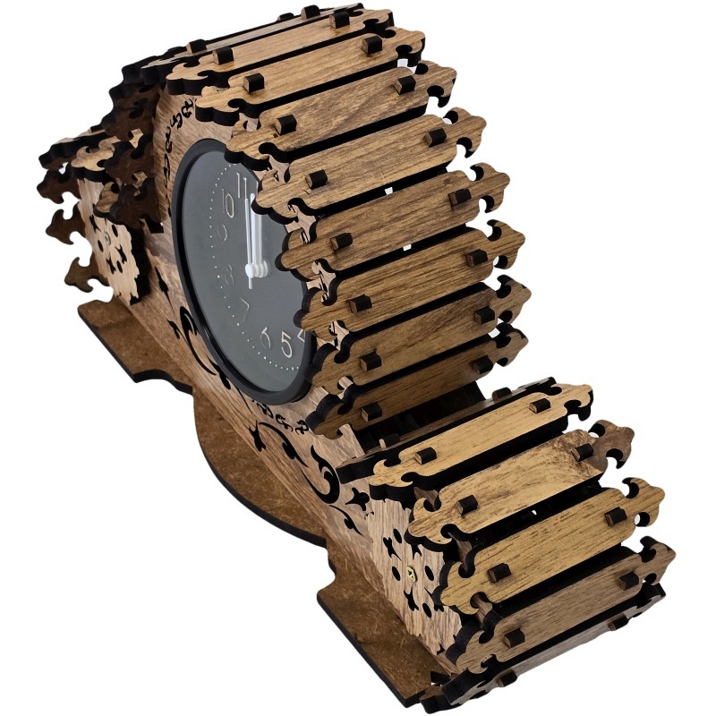 Cette horloge de table est un hommage à l'art traditionnel de la sculpture. Réalisée en bois naturel aux tons chaleureux, elle est minutieusement travaillée. Son design allie une symétrie délicate, des découpes décoratives et des lignes contrastées, créant ainsi un ensemble harmonieux. Son cadran à fond noir et ses chiffres dorés distinctifs, enchâssés dans un cadre aux formes raffinées, est l'élément principal. À la fois festive et chaleureuse, cette horloge est un accessoire intemporel empreint de l'esprit de la tradition artisanale.