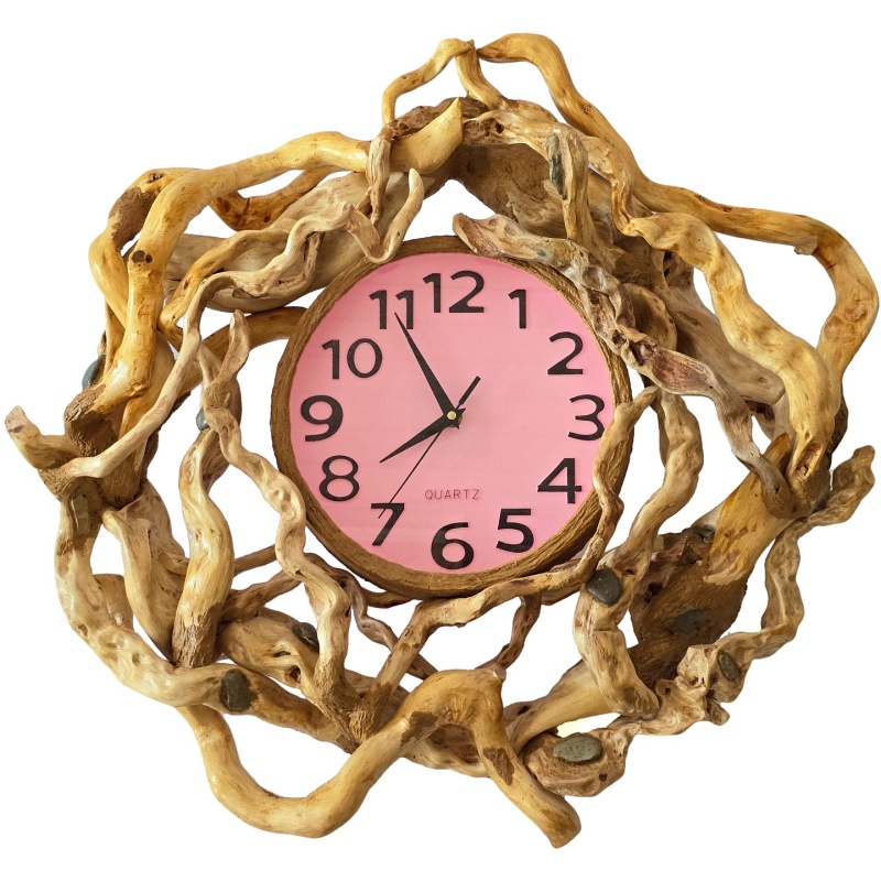 Cette horloge exceptionnelle en racine d'arbre est une pièce unique au design unique qui attire immédiatement le regard par sa forme organique inimitable et le contraste saisissant entre le bois naturel et le cadran rose. Le cadre de la montre est en véritable racine d'arbre, avec une surface plastique irrégulière qui semble avoir « poussé » de la nature elle-même. Chaque courbure, chaque tire-bouchon de la racine raconte sa propre histoire : le temps, les éléments et l'origine.