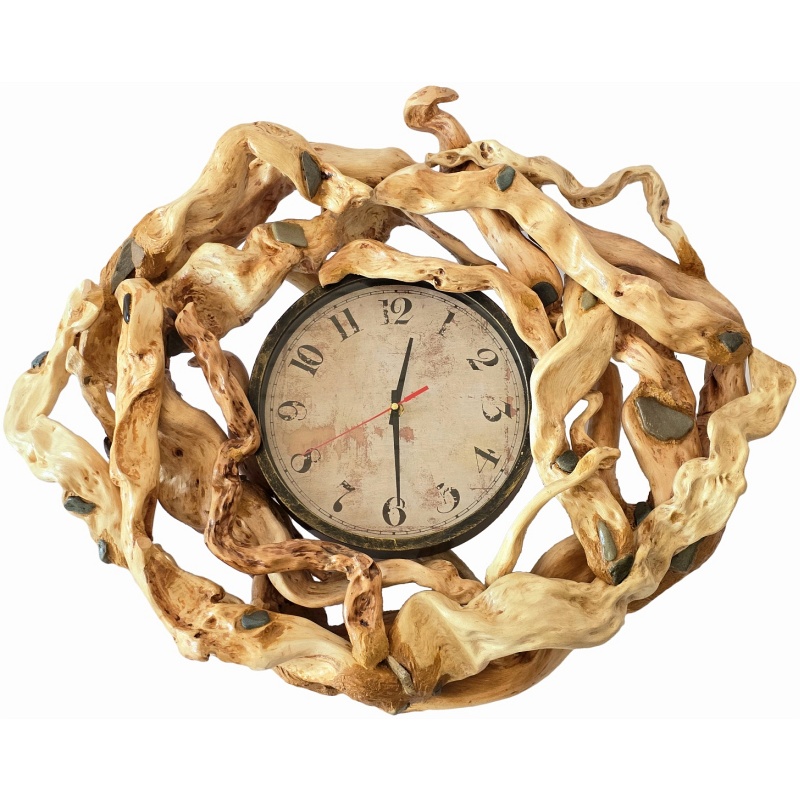 Cette remarquable horloge murale en racine d'arbre allie avec brio nature sauvage et style ancien. Son cadre est composé de morceaux de bois de racine sélectionnés à la main, aux formes irrégulières, aux rainures et aux lignes douces qui créent une impression de fluidité, comme si les branches et les racines s'enroulaient naturellement autour du mécanisme ancien. Des galets sont incrustés à la surface du bois, soulignant son origine naturelle et lui conférant une texture tangible.