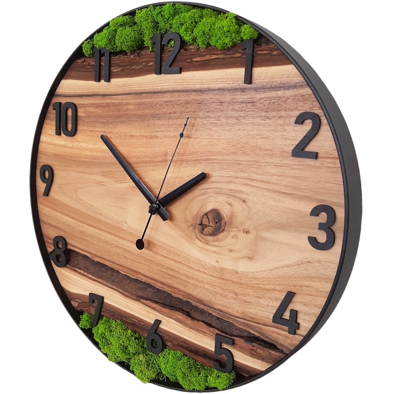Cette horloge unique en mousse, de forme circulaire et d'un diamètre de 40 cm, allie la beauté naturelle du bois massif à la fraîcheur délicate de la mousse verte stabilisée. Le contraste entre la teinte chaude du bois, les accents sombres des fissures et la verdure vibrante crée un élément harmonieux et moderne pour votre intérieur. Les chiffres et les aiguilles en métal noir complètent l'impression générale d'élégance naturelle et de fonctionnalité. Cette horloge est décorative et apporte une touche de nature à votre intérieur.
