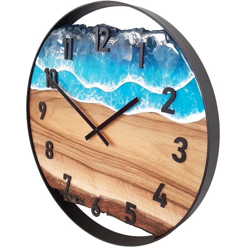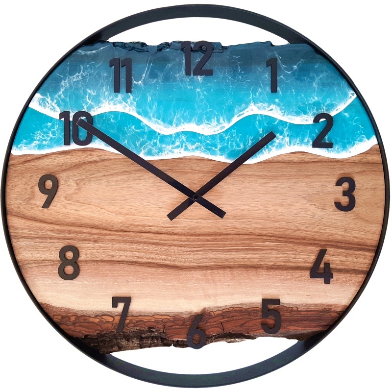 Cette horloge ronde en bois de 50 cm de diamètre est un exemple fascinant de l'alliance de la nature, de l'art et de la fonctionnalité. Son design est dominé par un magnifique motif marin : une vague vivante en résine époxy, d'un réalisme saisissant, contraste avec la teinte chaude du bois qui compose la partie « plage » du cadran. L'association du bleu vif de la mer, de l'écume blanche et de la structure naturelle du bois crée une expérience visuelle harmonieuse, évoquant la paix et la liberté.