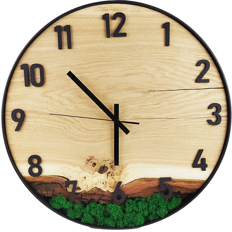 Cette horloge murale artisanale de 50 cm de diamètre impressionne dès le premier coup d'œil par son caractère naturel, la pureté du veinage du bois et la fraîcheur de ses touches de mousse verte. Le fond du cadran est en bois massif de haute qualité, aux couleurs naturelles et variées, avec sa structure en cernes annuels et ses fissures visibles. Ces dernières ne constituent pas un défaut, mais témoignent de l'authenticité et de l'individualité de chaque pièce. Au bas du cadran, une bande de mousse naturelle stabilisée apporte contraste, fraîcheur et un effet sensoriel agréable à la composition.