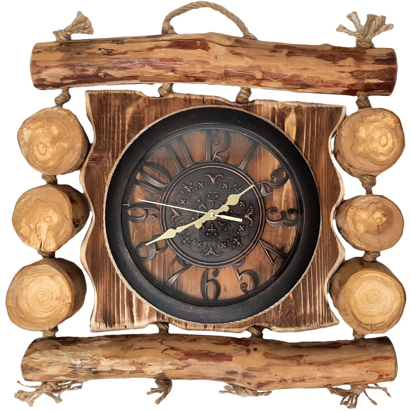 • Bois naturel artisanal – L'horloge est fabriquée en bois massif avec un motif naturel et des formes préservées qui soulignent le caractère rustique et l'unicité de chaque pièce.