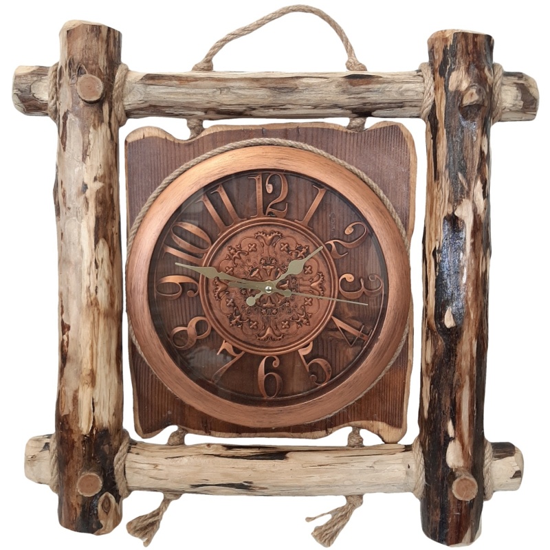 Cette impressionnante horloge murale est un accessoire décoratif remarquable alliant style rustique et savoir-faire artisanal. Son cadre massif en bois naturel et son cadran décoré aux reflets cuivrés lui confèrent un aspect massif, original et élégant. C'est un choix idéal pour les amateurs de matériaux traditionnels et de travail manuel.