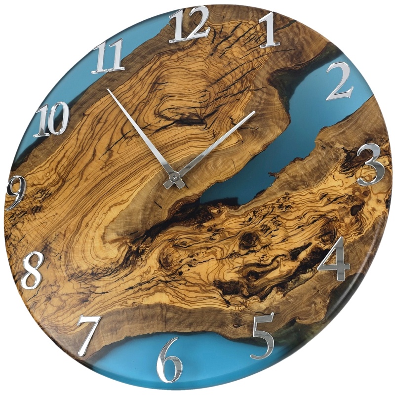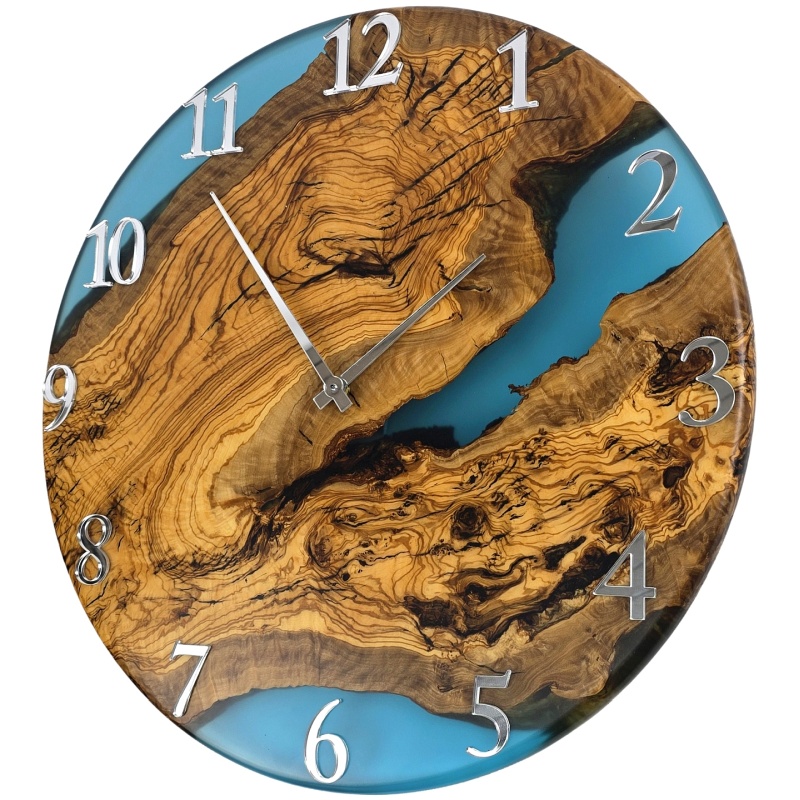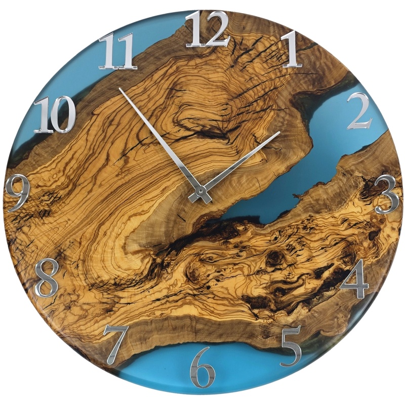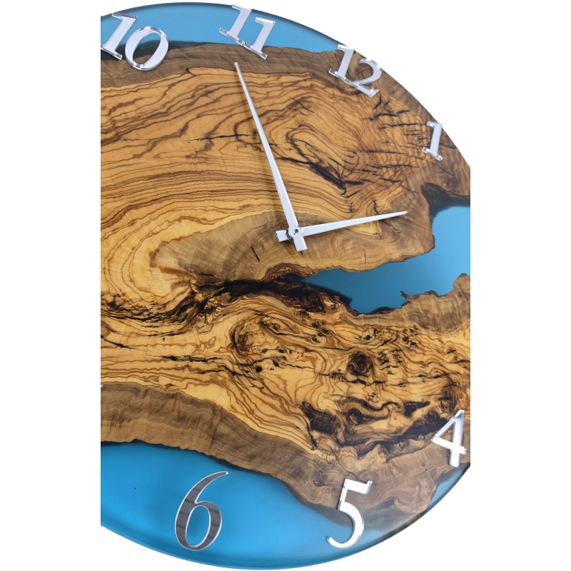 Cette magnifique horloge allie le veinage naturel du bois d'olivier à un design moderne en résine époxy bleu turquoise. Son élégant cadre métallique, associé à des chiffres et aiguilles argentés brillants, souligne le contraste entre nature et design. Ce solitaire unique attirera tous les regards dans n'importe quel espace.