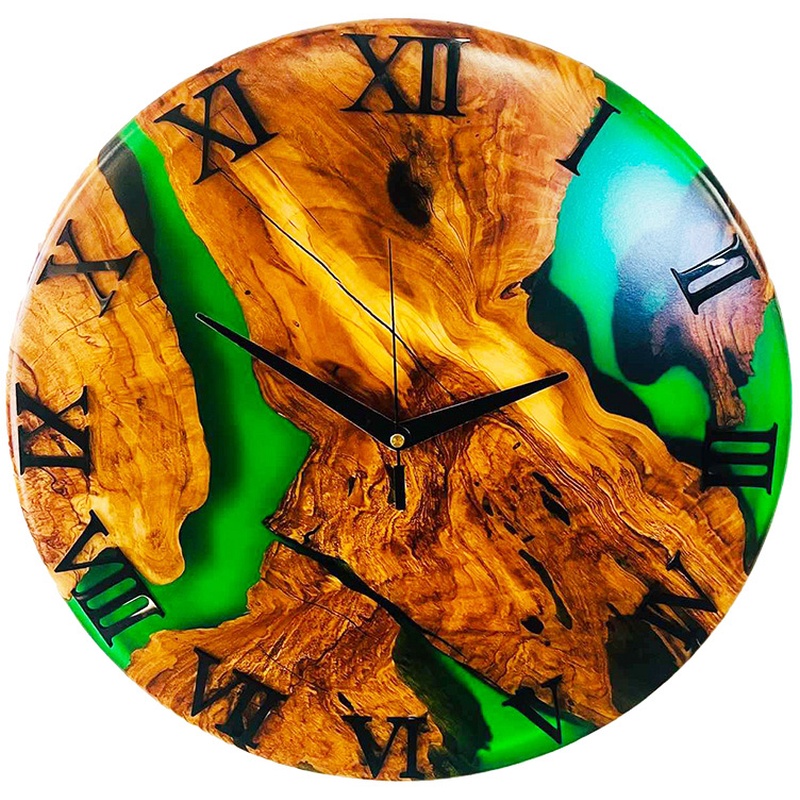 L'association du bois d'olivier et de la résine époxy vert vif crée cette pièce design fascinante qui attire le regard dès le premier regard. Cette horloge fabriquée à la main prouve que nature et design moderne peuvent aller de pair. Le veinage distinctif du bois contraste avec la fraîcheur des garnitures en résine et apporte originalité, chaleur et énergie à l'intérieur. Grâce aux chiffres romains et à la ligne épurée des aiguilles, le cadran est à la fois classique et moderne.