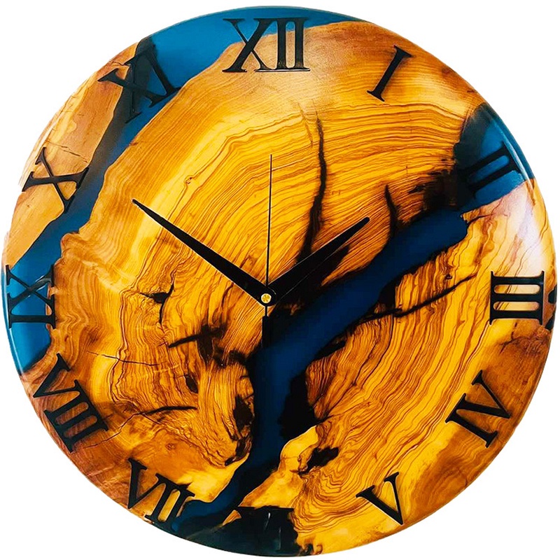 L'alliance de l'élégance et de la nature dans un élément décoratif saisissant. Cette horloge est fabriquée en bois d'olivier d'une beauté exceptionnelle, dont le motif unique et la couleur vive contrastent avec le bleu de la résine époxy. L'alliance de matériaux naturels et de résine moderne crée une œuvre d'art qui conserve sa fonctionnalité. Le bois soigneusement sélectionné à la main, sublimé par la profondeur bleu métallique de la résine, est la pièce maîtresse de tout intérieur.