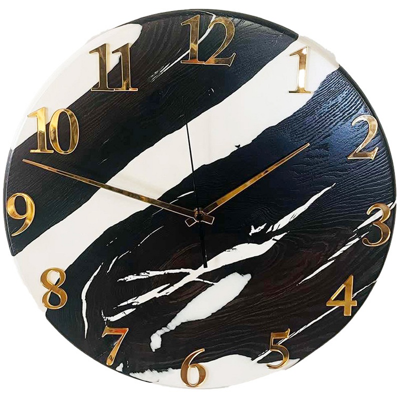 À la fois moderne et naturelle, cette horloge exceptionnelle offre un contraste visuel saisissant, créé par l'association de la texture sombre du bois d'olivier et des rayures blanches de la résine époxy. L'ensemble est souligné par des chiffres et des aiguilles en métal doré, qui apportent une touche luxueuse. Chaque pièce est soigneusement fabriquée à la main et conçue pour allier élégance naturelle et design contemporain.