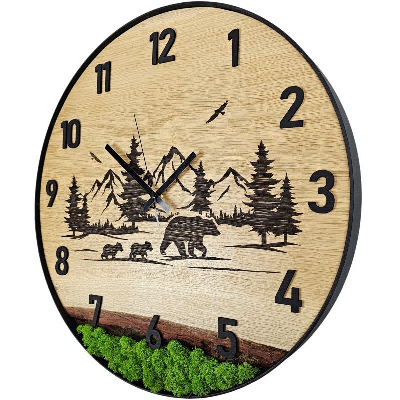 Cette horloge murale exceptionnelle de 50 cm est conçue comme un hommage à la nature, aux paysages forestiers et à la force paisible de la famille. Le motif dominant du cadran représente une famille d'ours marchant dans la forêt sous des montagnes majestueuses – une image qui exprime la force, la protection et le lien avec la nature. Le tout est gravé avec précision sur une planche de bois massif, dont le motif naturel et les subtiles irrégularités de couleur complètent son caractère artistique authentique. Le dessous de l'horloge est décoré d'une bande distinctive de mousse verte stabilisée, qui symbolise la forêt et confère à l'horloge fraîcheur, contraste et douceur naturelle.