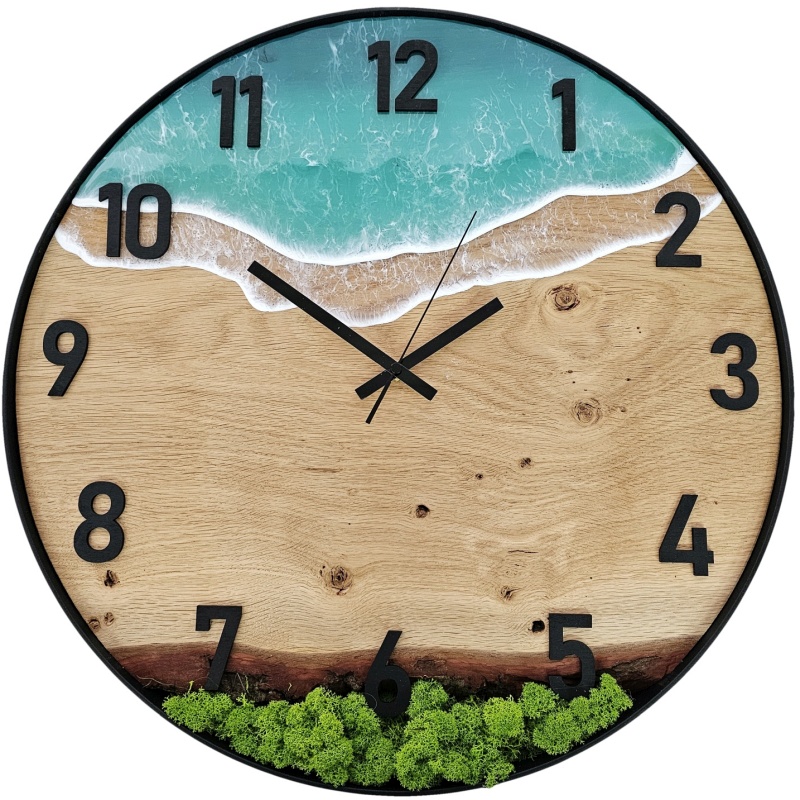 Cette horloge murale ronde de 50 cm de diamètre est une véritable œuvre d'art, alliant trois éléments naturels puissants : la mer, la terre et la verdure. La partie supérieure du cadran est ornée d'un motif de vagues marines d'un réalisme fascinant, réalisé en résine époxy. Les tons turquoise clairs et les bords délicatement moussés évoquent le ressac, tandis que la partie inférieure est sublimée par une mousse stabilisée d'un vert vif, symbole de vie et de fraîcheur. La partie centrale, dominante, est en bois précieux, au motif distinctif et aux imperfections naturelles, telle la structure du sable entre mer et verdure.