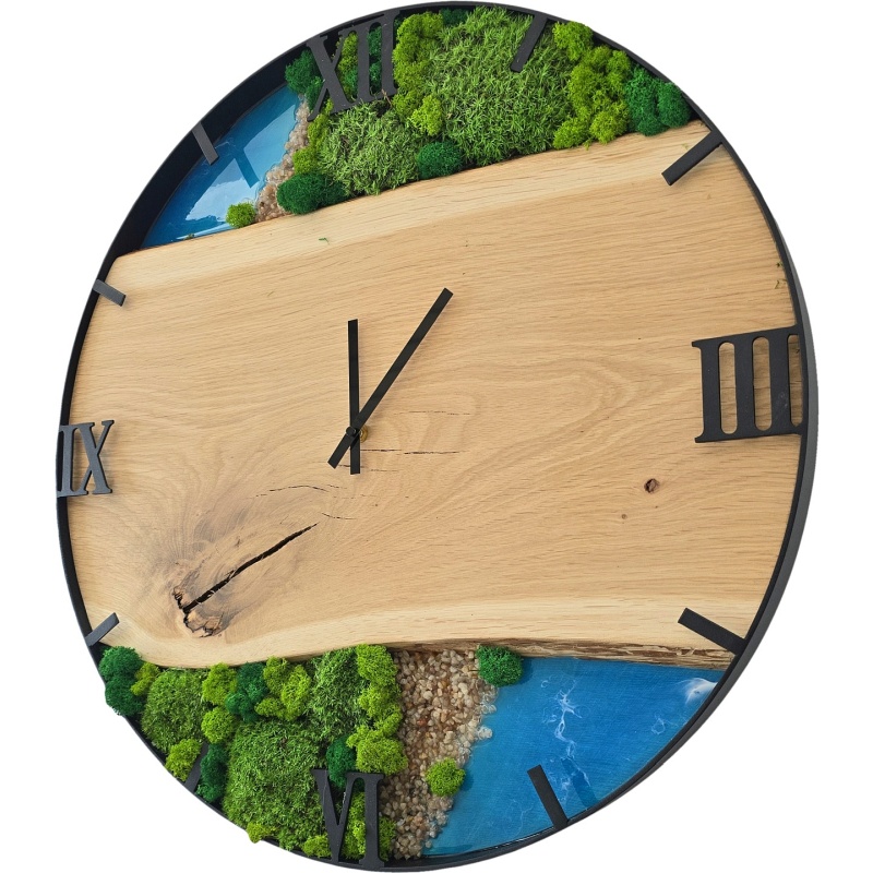 L'association du bois naturel, de l'époxy et de la mousse : un concept de design exceptionnel. Cette horloge allie trois univers visuels et matériels distincts : la chaleur du bois naturel, la mousse verte luxuriante et une « rivière en époxy » brillante, agrémentée de sable et de galets. Chaque regard est comme un retour à la nature.