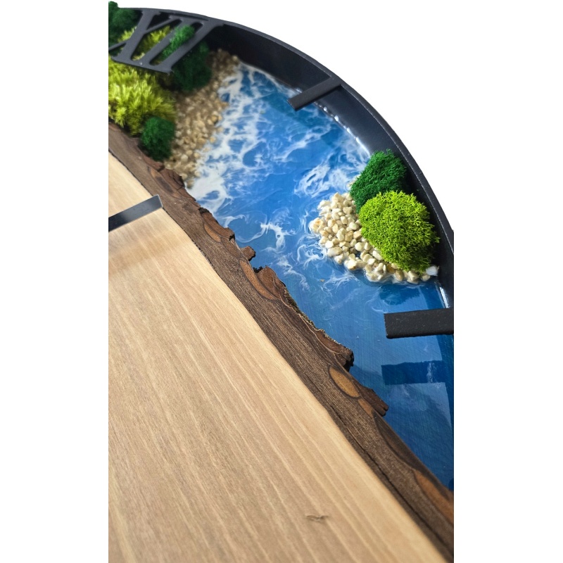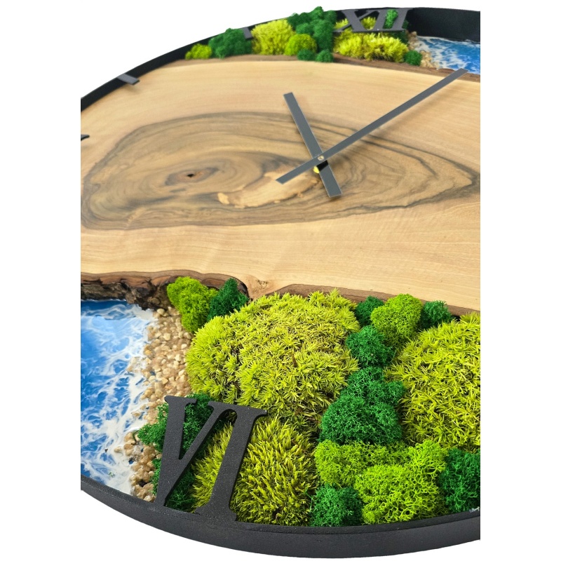 Cette horloge circulaire originale de 60 cm de diamètre vous séduira dès le premier regard par son association exceptionnelle de bois naturel, d'un vert mousse éclatant et d'une résine époxy transparente, imitant la surface de l'eau. Le cœur du cadran est dominé par un magnifique motif boisé, sublimé par le bleu de l'époxy évoquant une rivière ou un lac, et par un mélange coloré de mousse stabilisée aux nuances variées. Le résultat est une pièce design qui apportera calme, fraîcheur et un brin de nature à votre espace.