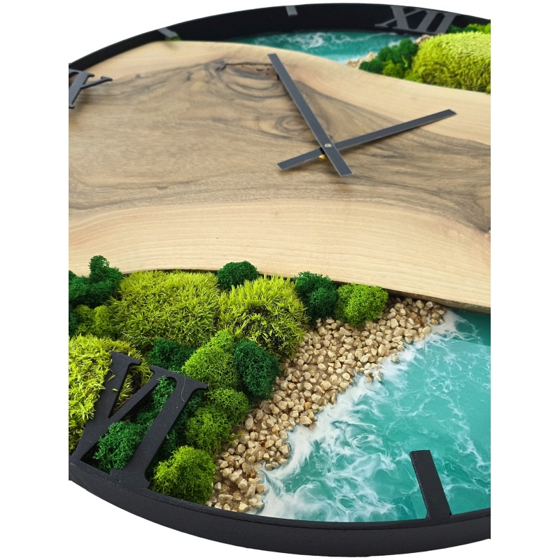 Cette horloge murale design allie harmonieusement nature, esthétique et fonctionnalité. Visuellement, elle évoque un paysage détaillé : une rivière entourée de mousse et de galets, qui coule à travers un magnifique morceau de bois massif. Ce modèle fabriqué à la main allie savoir-faire artisanal et rendu artistique d'un motif naturel, ce qui en fait un élément remarquable dans tout intérieur. Sa forme ronde et le contraste des chiffres romains et des aiguilles en métal avec le bois soulignent son intemporalité.
