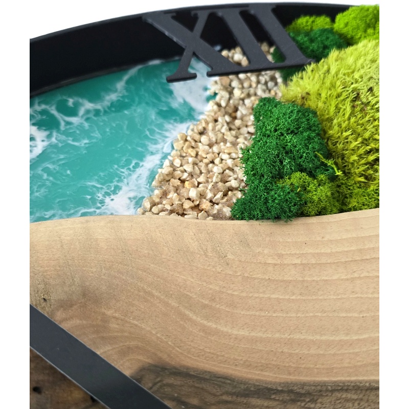 Matériaux naturels et durables de première qualité – Le bois est travaillé avec soin pour mettre en valeur sa structure, tandis que la résine époxy lui confère profondeur et brillance. La mousse conserve sa douceur et son vert pendant de nombreuses années sans aucun entretien.