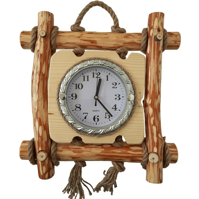 Cette horloge murale décorative allie harmonieusement style artisanal, esthétique traditionnelle et fonctionnalité. Son élément principal est un cadre massif en rondins de bois au veinage prononcé, préservant ainsi la forme et la structure naturelles de l'objet. Le panneau intérieur en bois clair aux finitions soignées contraste joliment avec le cadran, encadré d'un élément décoratif en métal argenté au délicat motif plastique. L'horloge est assemblée avec une corde solide et ornée de nœuds et de pompons traditionnels, ce qui lui confère un charme rustique et une allure authentique.