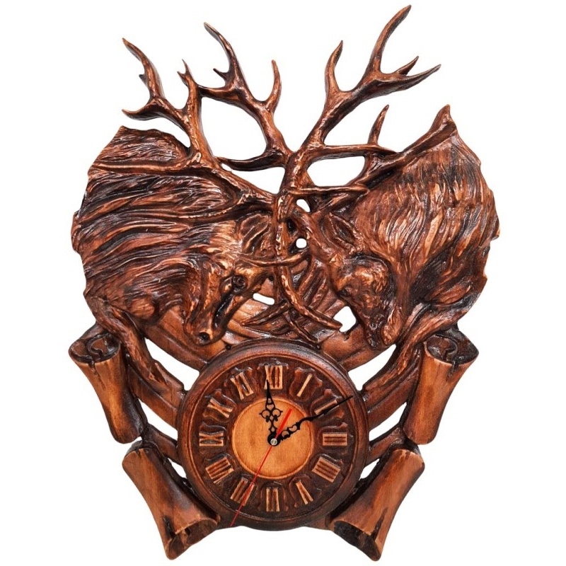 Cette impressionnante horloge murale en bois, ornée d'un motif dominant de tête de cerf, allie savoir-faire artisanal, majesté des animaux de la forêt et force des matériaux naturels. Deux têtes de cerf réalistes aux bois entrelacés créent une composition dynamique qui capture l'instant d'un duel naturel ou d'une rencontre symbolique en forêt. Cette scène porte un message visuel et symbolique fort et fait de cette horloge non seulement un objet pratique, mais aussi une pièce décorative exceptionnelle.