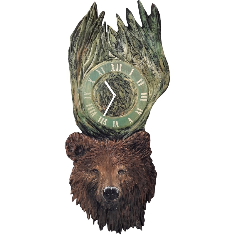 Cette horloge murale unique en forme de tête d'ours allie savoir-faire artisanal, symbolisme forestier et design fonctionnel. Son élément principal est un ours sculpté avec précision, dont l'expression est à la fois majestueuse et protectrice. Le cadran à chiffres romains est intégré à un fond en plastique au motif forestier, transformant l'ensemble en une œuvre d'art naturelle. L'horloge se distingue par son caractère rustique, son travail authentique et sa texture riche, qui soulignent la nature sauvage et la force de l'ours, roi de la forêt.