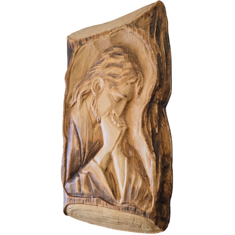 Ce relief en bois exceptionnel représente Jésus-Christ en prière silencieuse, la tête penchée et les mains jointes dans un geste de profonde humilité et de concentration spirituelle. Sculpté dans une seule pièce de bois massif, dont le bord irrégulier évoque la forme naturelle d'un arbre, il est porteur d'une forte symbolique : un retour à la nature, à Dieu, au silence. Cette image représente non seulement un moment de contemplation et de prière personnelle du Christ, mais apporte également paix, profondeur et beauté digne à l'espace. Avec ses dimensions de 36 × 22 cm, il est idéal pour diverses configurations : accroché au mur, posé sur une étagère, un autel ou directement intégré dans un coin spirituel. Grâce à un travail manuel, chaque pièce possède une expression, un motif et une teinte uniques. Les zones sombres et claires soulignent la plasticité de la sculpture et renforcent l'effet émotionnel de la scène. Cette image devient ainsi non seulement décorative, mais surtout le centre spirituel de votre intérieur.