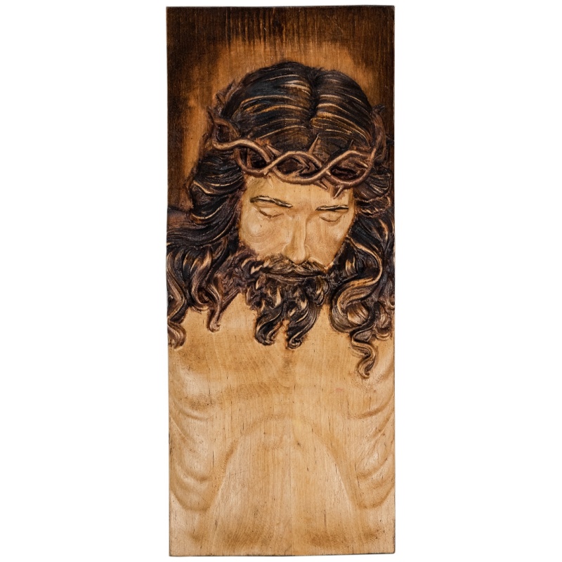 Ce bas-relief profondément émouvant de Jésus-Christ couronné d'épines est une puissante expression d'humilité, de souffrance et de force spirituelle sereine. Sculpté dans du bois massif, aux dimensions idéales pour être suspendu ou placé dans un coin spirituel, il capture le visage du Christ penché dans la douleur et la prière. Son expression, ses yeux clos et ses traits profonds véhiculent un message de sacrifice et de dévotion sereine. La couronne d'épines est sculptée avec précision dans un ton contrasté plus foncé qui détache visuellement la tête du fond et crée un effet plastique puissant.Le bois est subtilement teinté : la partie supérieure, plus sombre, de l'image se fond harmonieusement dans la partie inférieure plus claire, ce qui renforce le caractère dramatique de la scène tout en soulignant son caractère naturel. Ce tableau n'est pas seulement une œuvre d'art, mais aussi un objet spirituel intime qui apporte paix, silence et recueillement au quotidien. Grâce à son travail artisanal, chaque œuvre possède son propre caractère, son dessin unique et son énergie.
